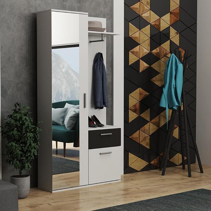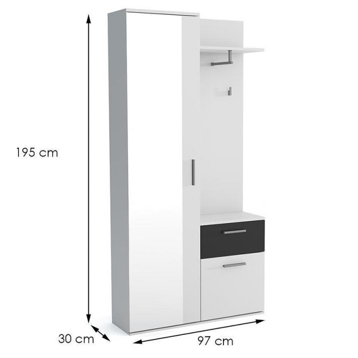 Kolekcja Justus to nowoczesne i stylowe meble do przedpokoju wykonane z płyty wiórowej laminowanej. Konstrukcja składa sie z dwóch części szafy oraz szafki z szufladą i wieszakami. Znajdzie się tu miejsce, aby schować buty, powiesić kurtkę czy położyć torebkę.