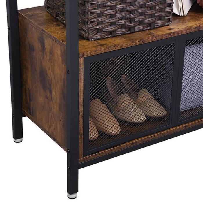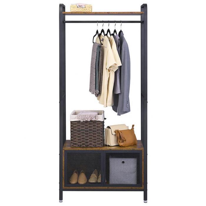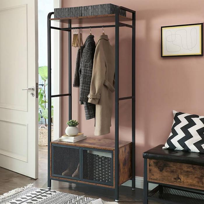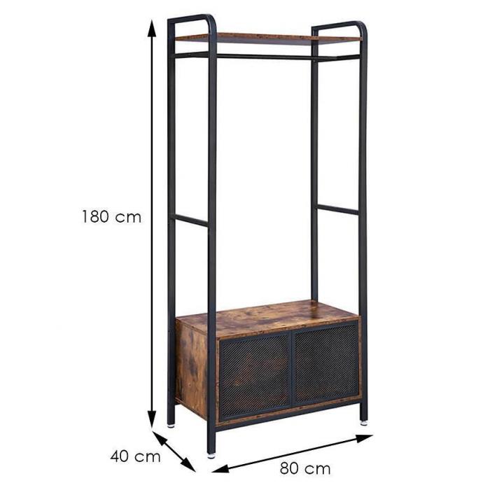 Garderoba Industrial w kolorze brązowy/czarny to świetna propozycja do przedpokoju. Dzięki swojej kolorystyce wpasuje się w większość aranżacji. Jest bardzo praktyczna i funkcjonalna. Pomoże zachować porządek w pomieszczeniu, gdyż posiada wystarczającą ilość miejsca. Całość została wykonana z płyty wiórowej laminowanej oraz metalu.