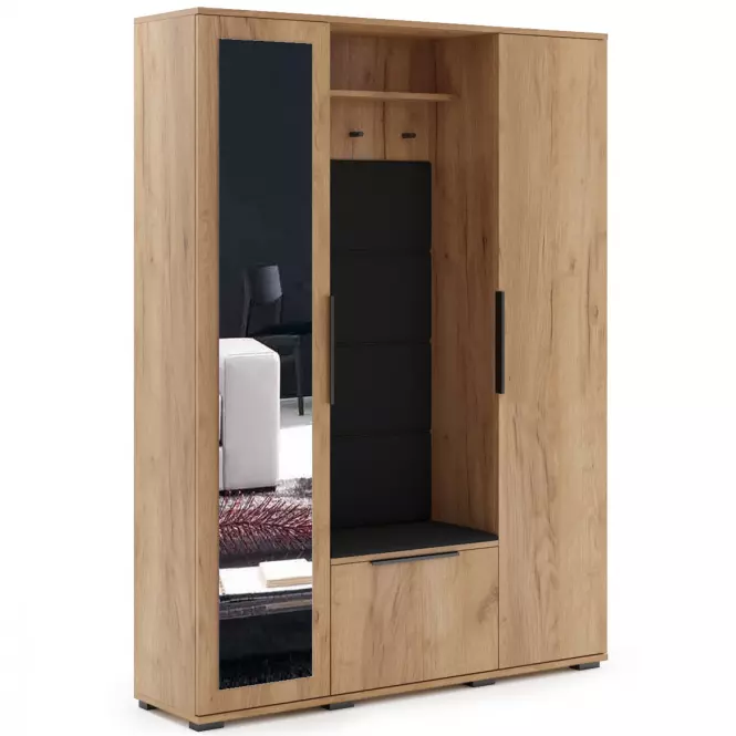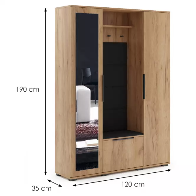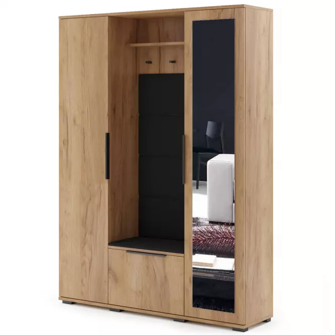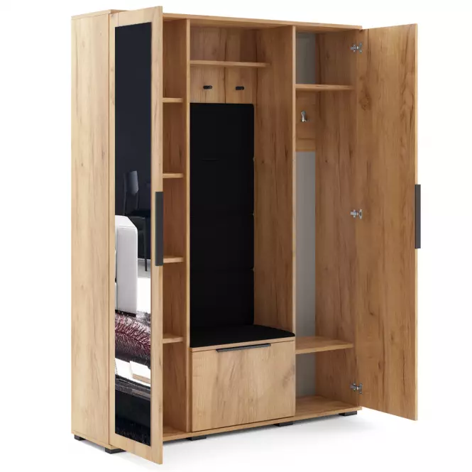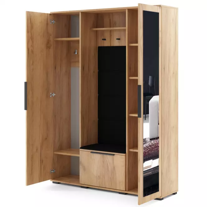 Całość garderoby charakteryzuje prosty, nowoczesny design, który świetnie wpisuje się w różnorodne aranżacje wnętrz — od minimalistycznych, po bardziej klasyczne. Wyjątkowe wybarwienie w odcieniu craft złoty dodaje ciepła i elegancji, a zarazem podkreśla naturalny urok drewna, co sprawia, że garderoba Laura P stanowi atrakcyjny akcent dekoracyjny każdego pomieszczenia. Solidna konstrukcja mebla zapewnia jego stabilność, a przemyślany układ półek i wieszaków oferuje mnóstwo miejsca do przechowywania zarówno odzieży wierzchniej, jak i innych elementów garderoby.
