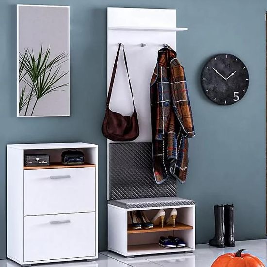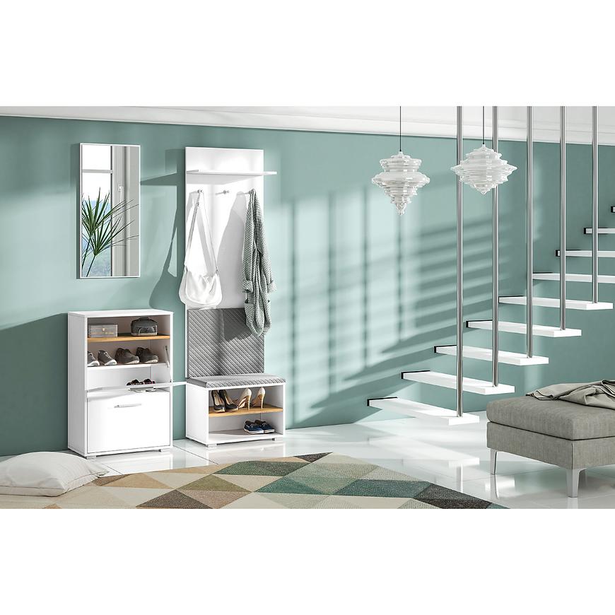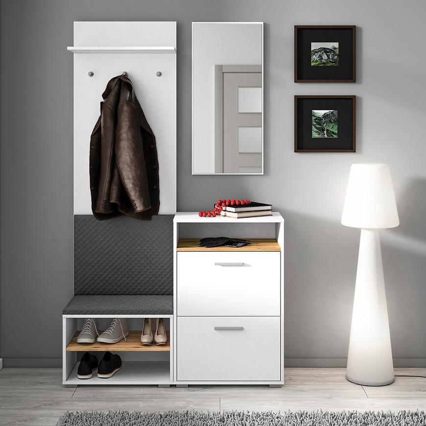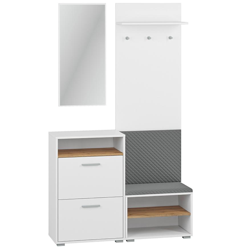 Zestaw Loret obejmuje cztery elementy: lustro, wieszak na ubrania oraz dwie szafki na buty, co sprawia, że garderoba jest kompletnym rozwiązaniem do przechowywania ubrań, butów i dodatków.