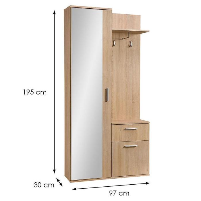 Zestaw zawiera panel z szafką oraz szafę z lustrem i drążkiem na ubrania. Dzięki, którym zyskamy łatwo dostępną przestrzeń do przechowywania rzeczy, ubrań i butów.