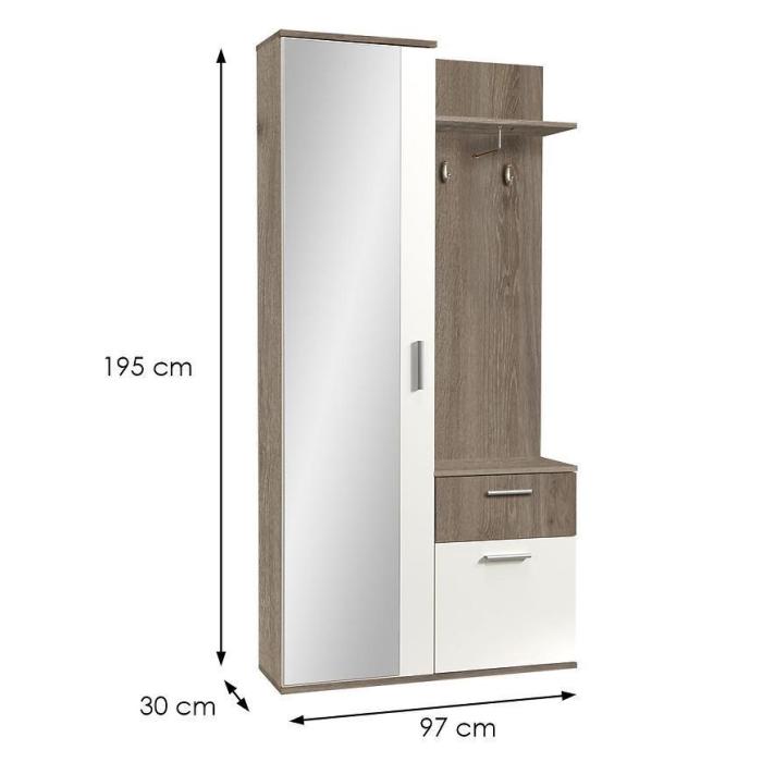 Zestaw zawiera panel z szafką oraz szafę z lustrem i drążkiem na ubrania. Dzięki, którym zyskamy łatwo dostępną przestrzeń do przechowywania rzeczy, ubrań i butów.