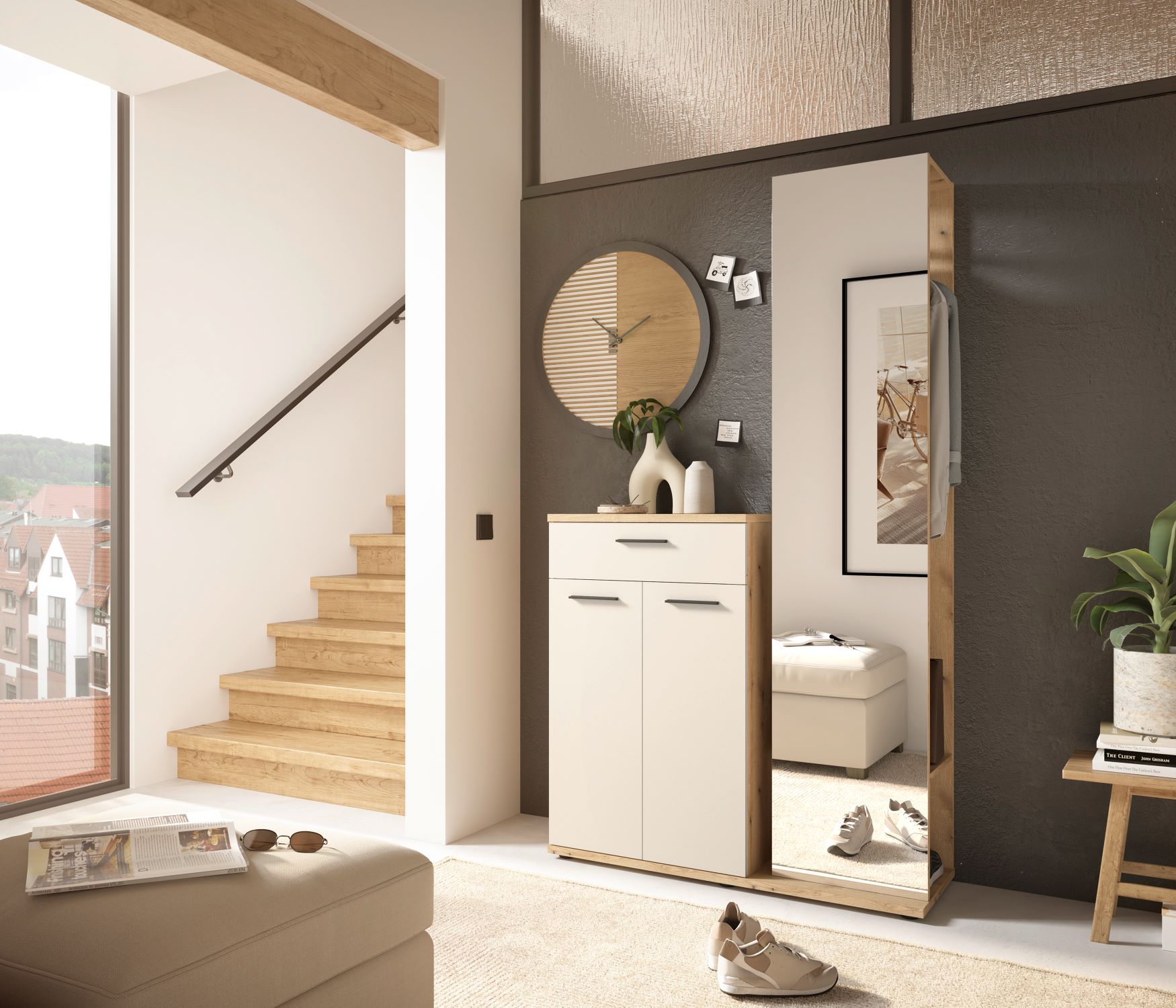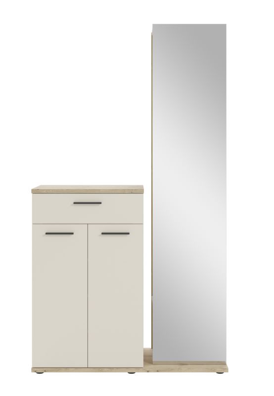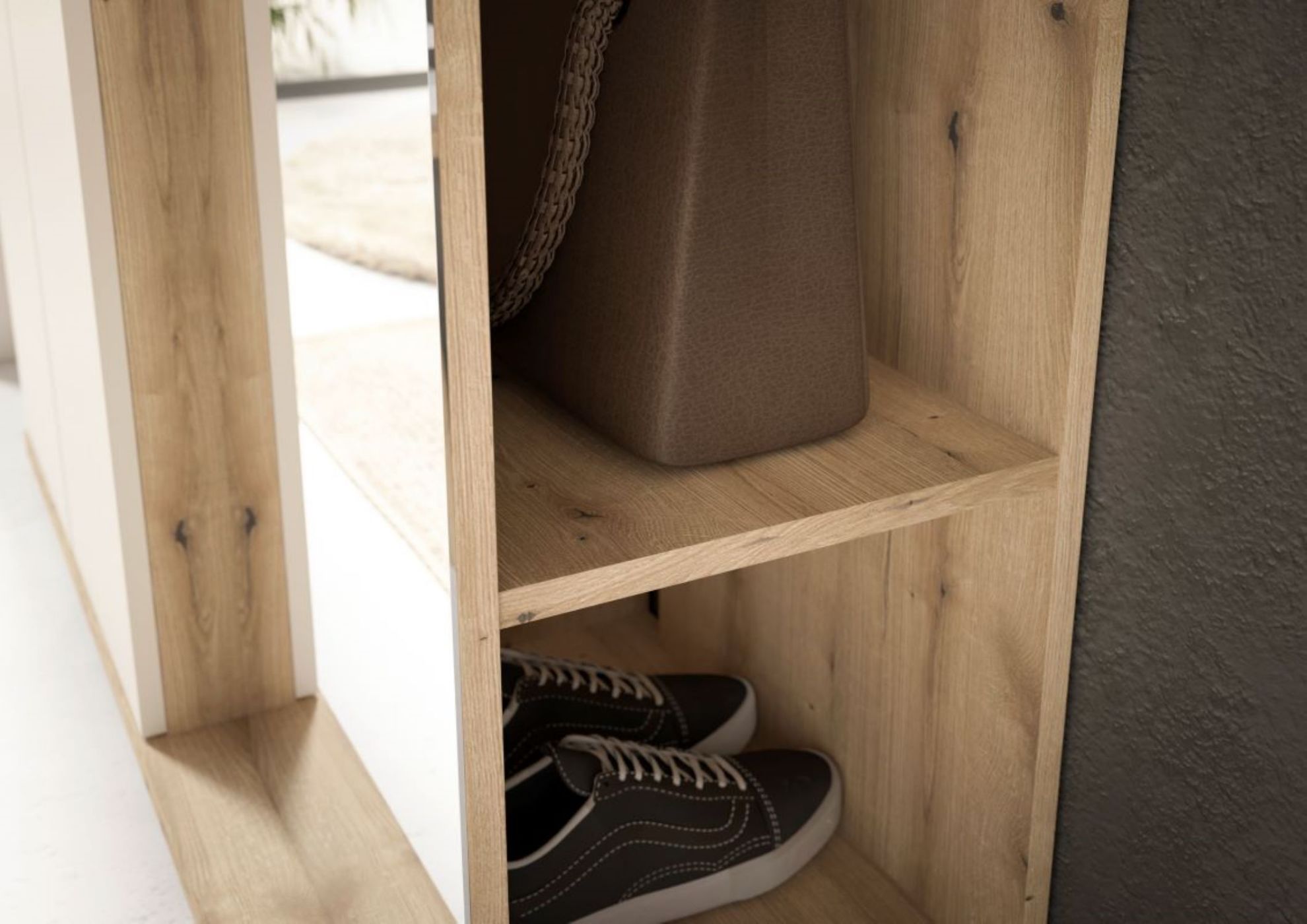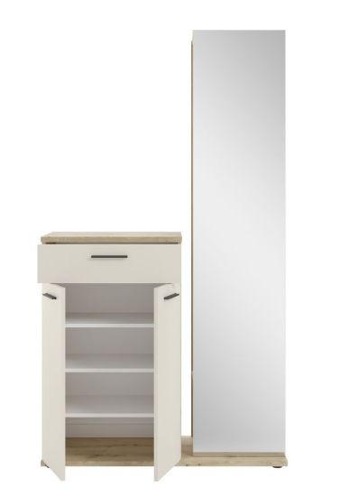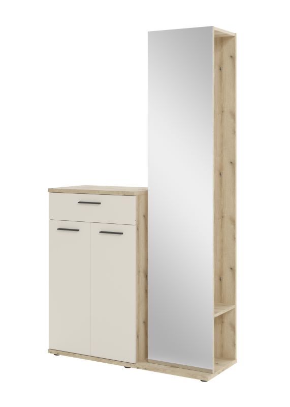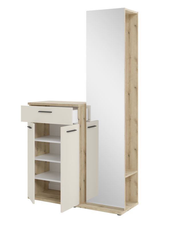 ✔ Regału z lustrem – wyposażony w drążek na ubrania oraz półkę, idealny do wieszania płaszczy, kurtek i akcesoriów. - Funkcjonalność i wygoda – garderoba zapewnia wystarczającą ilość miejsca na codziennie używane przedmioty, a lustro optycznie powiększa przestrzeń i ułatwia szybkie sprawdzenie wyglądu przed wyjściem.