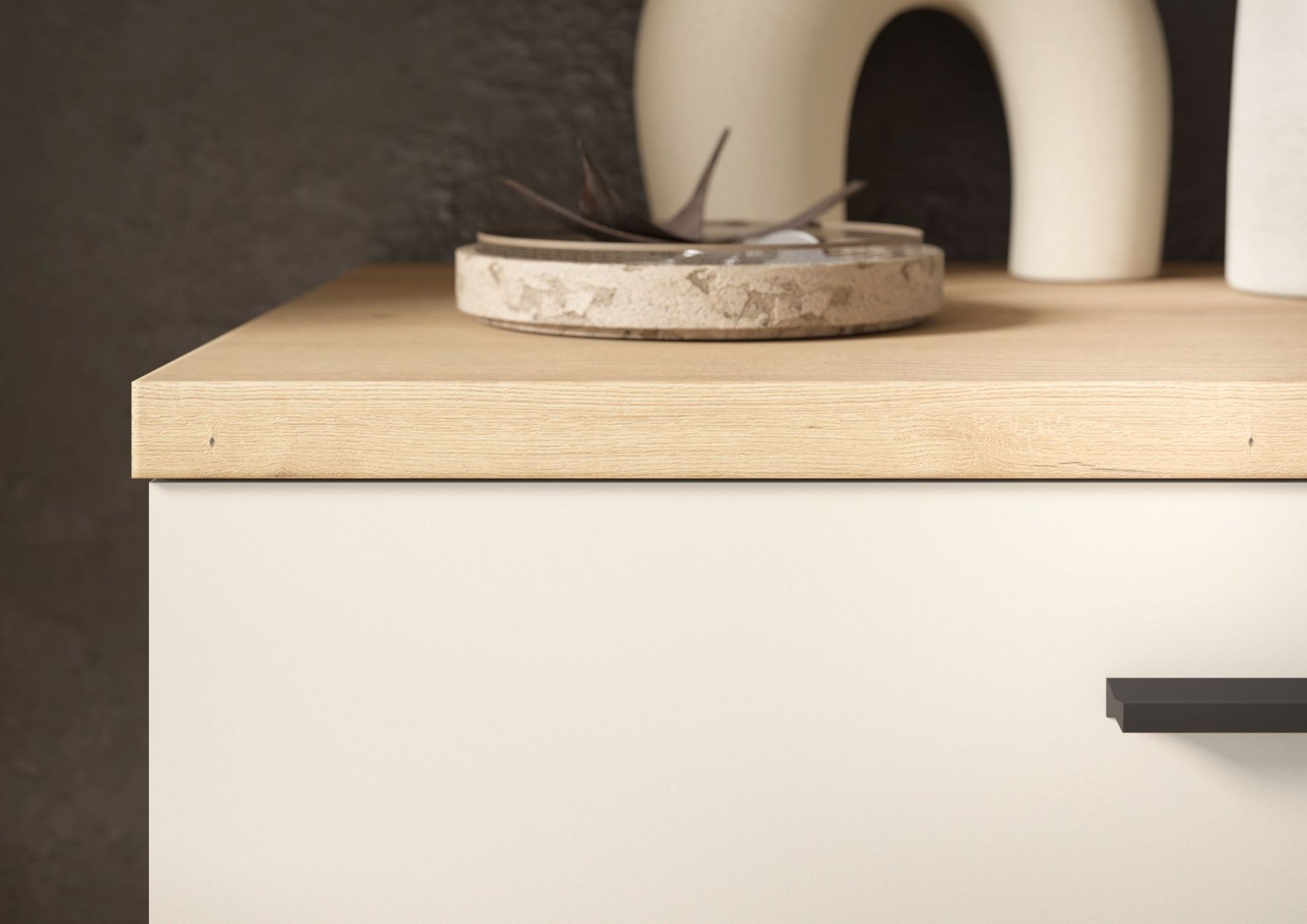 - Nowoczesne połączenie kolorów – korpus w dekorze dąb evoke i fronty w eleganckim dekorze kashmir z matowym wykończeniem tworzą harmonijną i stylową całość.