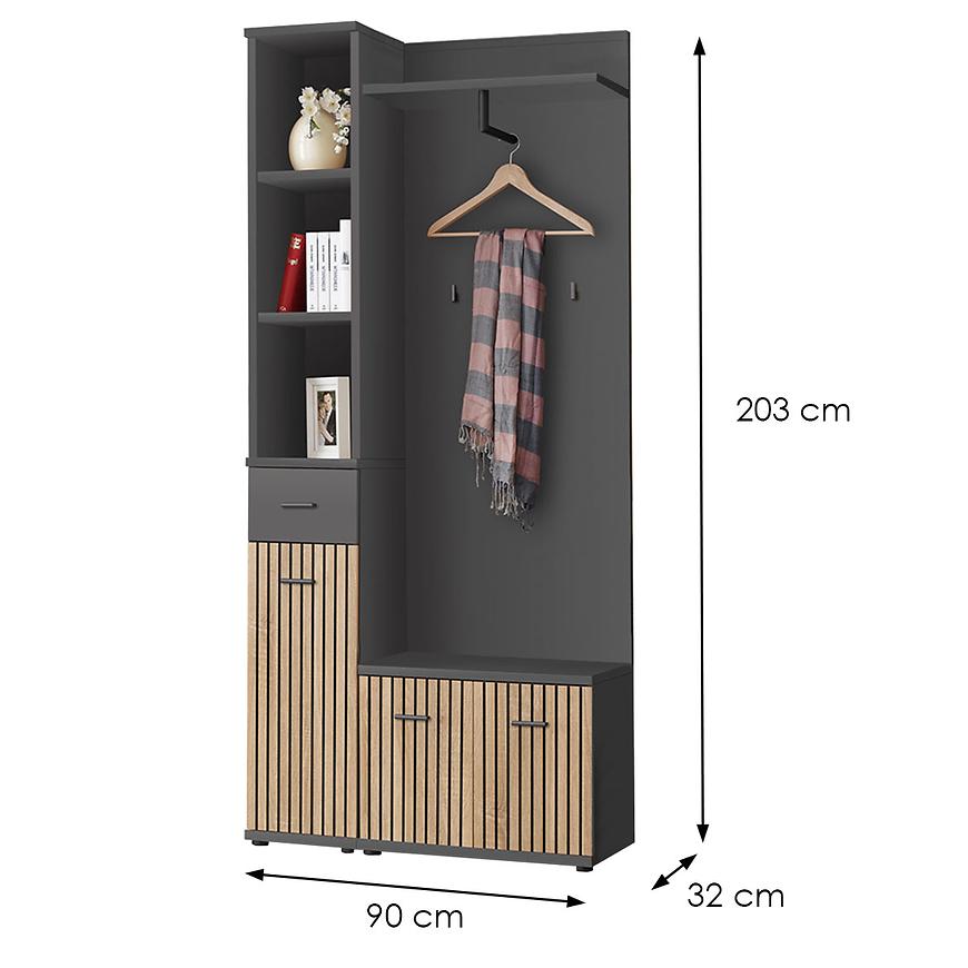 Kolorystyka garderoby to harmonijne połączenie dąb artisan z antracytowym kolorem, co nadaje meblowi eleganckiego charakteru. Fronty w matowym wykończeniu dodają meblowi wyrafinowanego wyglądu. Konstrukcja garderoby oparta jest na solidnej płycie wiórowej laminowanej, co gwarantuje jej trwałość i odporność na codzienne użytkowanie.