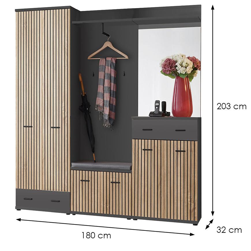 Kolorystyka garderoby to harmonijne połączenie dąb artisan z antracytowym kolorem, co nadaje meblowi eleganckiego charakteru. Fronty w matowym wykończeniu dodają meblowi wyrafinowanego wyglądu. Konstrukcja garderoby oparta jest na solidnej płycie wiórowej laminowanej, co gwarantuje jej trwałość i odporność na codzienne użytkowanie.