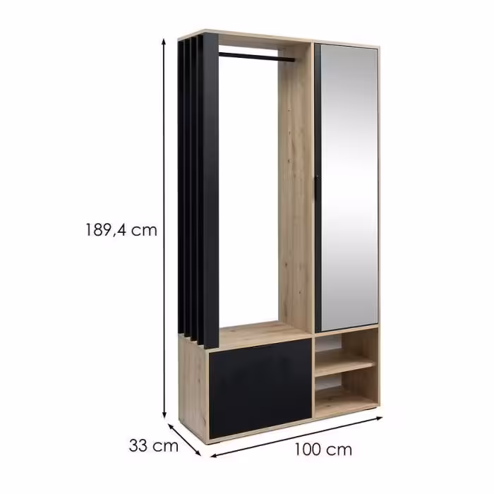 Zestaw zawiera panel z drążkiem, szafę z lustrem i półkami oraz szafkę na obuwie . Dzięki, którym zyskamy łatwo dostępną przestrzeń do przechowywania rzeczy, ubrań i butów.