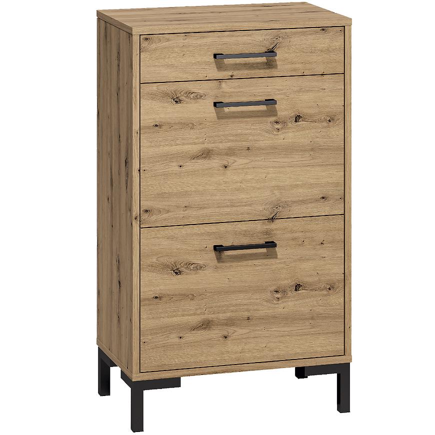Jasne drewnopodobne wybarwienie, zarówno korpusu, jak i frontów w kolorze dąb artisan, nadaje meblowi naturalnego i ciepłego charakteru. Konstrukcja oparta na płycie wiórowej laminowanej gwarantuje trwałość i solidność, co sprawia, że garderoba jest gotowa sprostać codziennym wymaganiom.