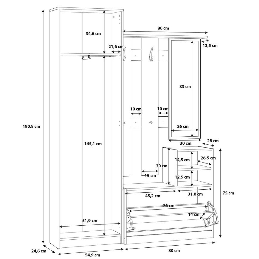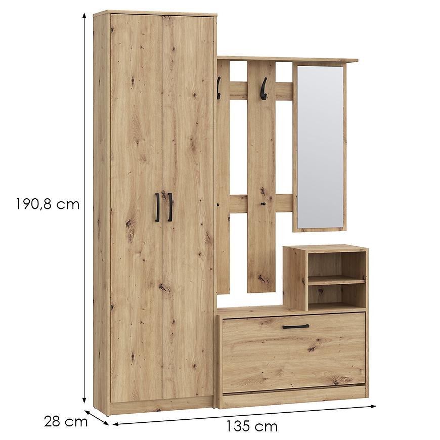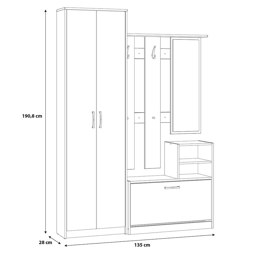 Garderoba Niko ma proporcjonalne wymiary, które pozwalają na optymalne przechowywanie ubrań i akcesoriów. Jej wysokość wynosząca 190,8 cm zapewnia wystarczającą ilość miejsca do przechowywania, a szerokość 135 cm i niewielka głębokość 28 cm pozwalają na umieszczenie jej nawet w mniejszych przedpokojach.