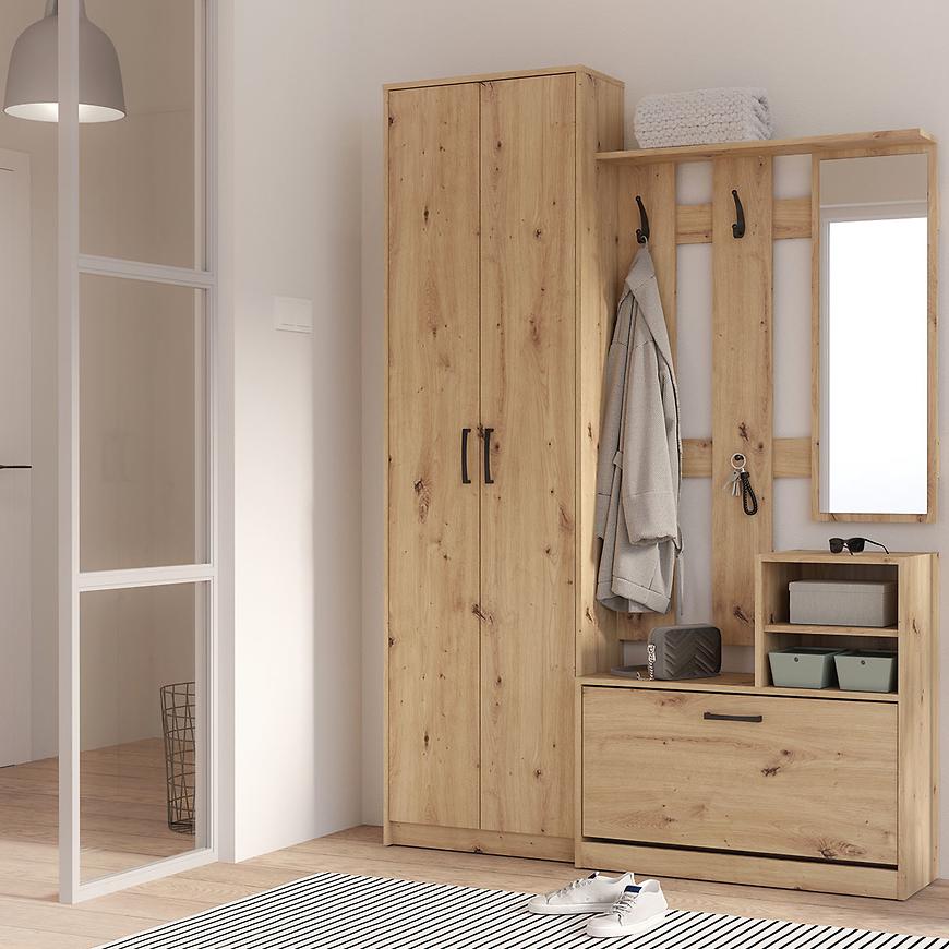 Ta funkcjonalna garderoba pomaga utrzymać porządek w przedpokoju, dzięki możliwości zawieszenia ubrań na wieszakach oraz przechowywania butów w szafkach