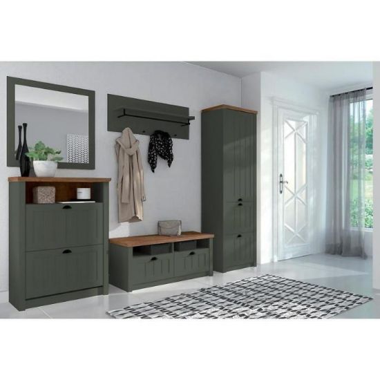 Garderoba Prowancja to najlepszy wybór mebli do Twojego przedpokoju. Jest zarówno praktyczna jak i funkcjonalna. Wpasuje się w większość aranżacji, wnosząc do pomieszczenia nowoczesność. W zestawie znajdują się: półka z wieszakami, stojaca szafa, szafka na buty z siedziskiem, lustro oraz stojąca szafka na buty. Całość wykonana jest z płyty wiórowej laminowanej.