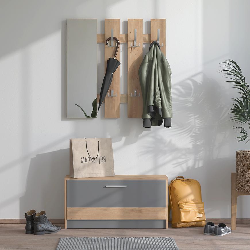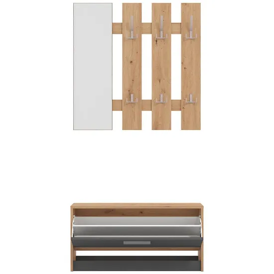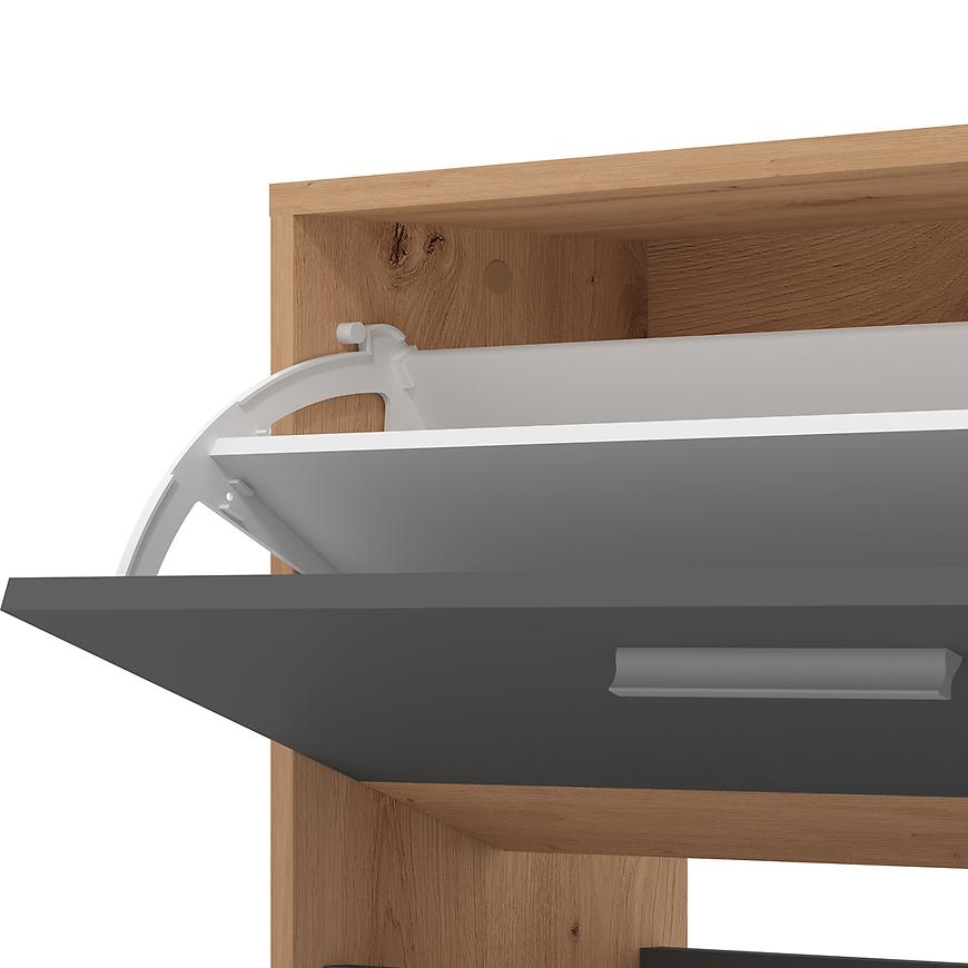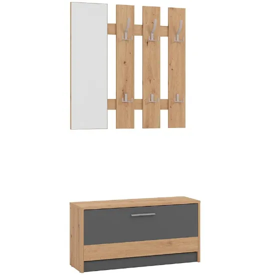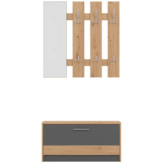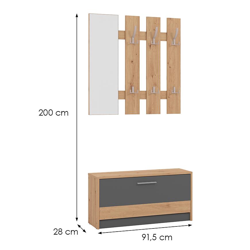Garderoba Rimini Artisan/Grafit 11011705 to nowoczesny mebel, który łączy funkcjonalność z estetyką. Wykonana z wysokiej jakości płyty wiórowej laminowanej, charakteryzuje się trwałością i odpornością na uszkodzenia. Jej minimalistyczny design, połączenie odcieni dębu artisan i grafitu, sprawia, że doskonale komponuje się w różnych aranżacjach wnętrz, od nowoczesnych po klasyczne.