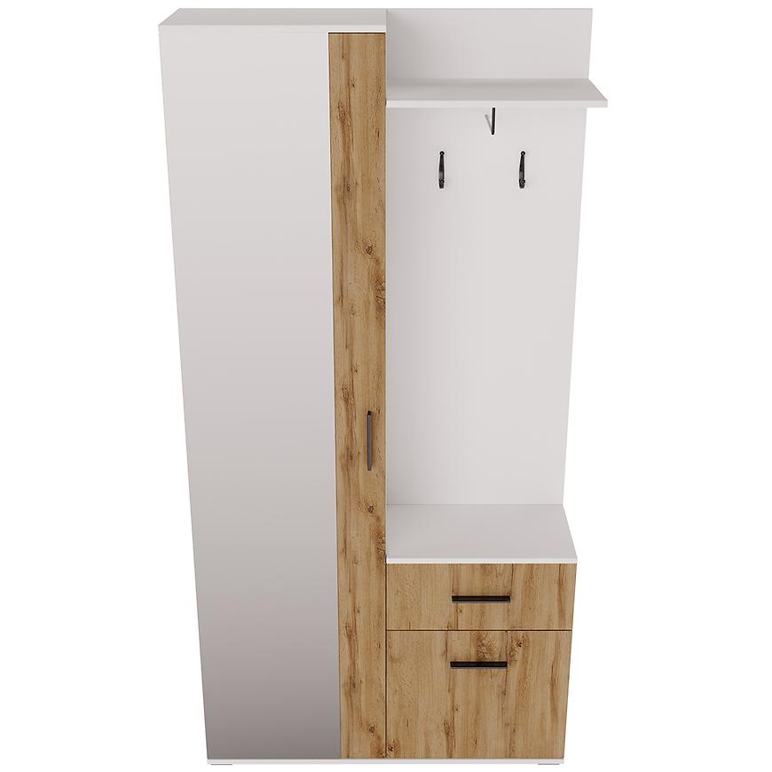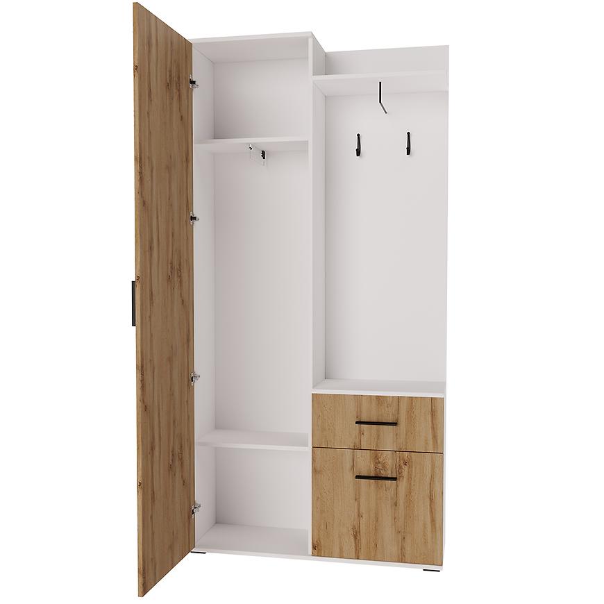 Garderoba Rio o wysokości 195 cm, szerokości 97 cm i głębokości 30 cm oferuje wystarczającą przestrzeń do przechowywania odzieży, butów i akcesoriów, co czyni ją praktycznym rozwiązaniem do organizacji codziennego porządku. W jej wnętrzu znajdziesz przestronne półki, wieszaki na ubrania oraz miejsce na obuwie, co ułatwia utrzymanie ładu i porządku. Garderoba nie wymaga montażu do ściany, co oznacza, że można ją ustawić w dowolnym miejscu, dostosowując do swoich potrzeb aranżacyjnych.