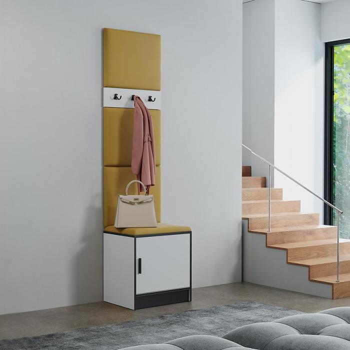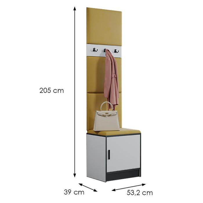 W skład zestawu wchodzi panel z wieszakami i szafką na dole. Dzięki, którym zyskamy łatwo dostępną przestrzeń do przechowywania rzeczy,ubrań i butów.
