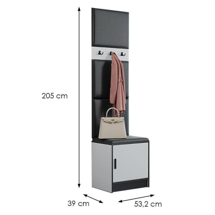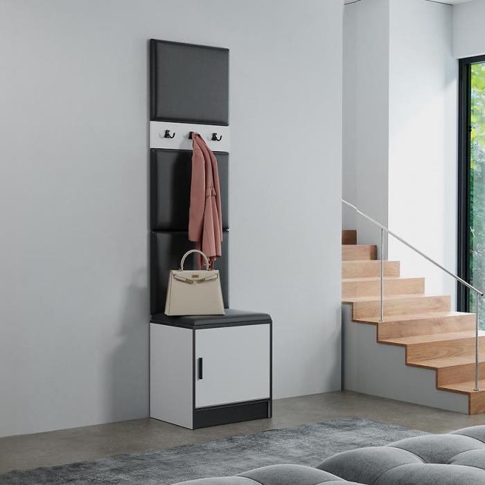 W skład zestawu panel z wieszakami i szafką na dole. Dzięki, którym zyskamy łatwo dostępną przestrzeń do przechowywania rzeczy,ubrań i butów.