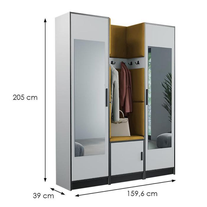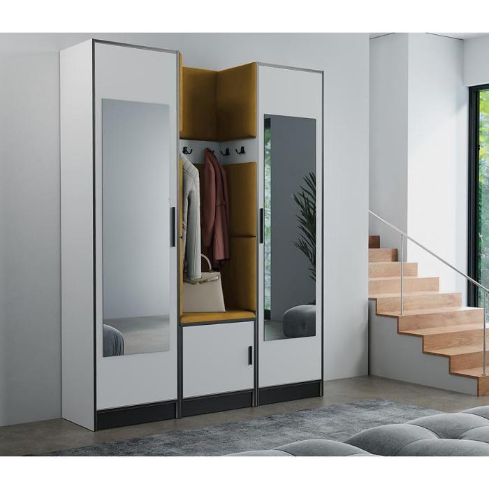 W skład zestawu wchodzi panel z wieszakami,szafką na dole i szafami. Dzięki, którym zyskamy łatwo dostępną przestrzeń do przechowywania rzeczy,ubrań i butów.