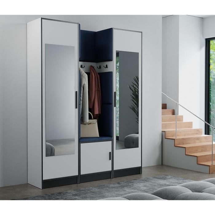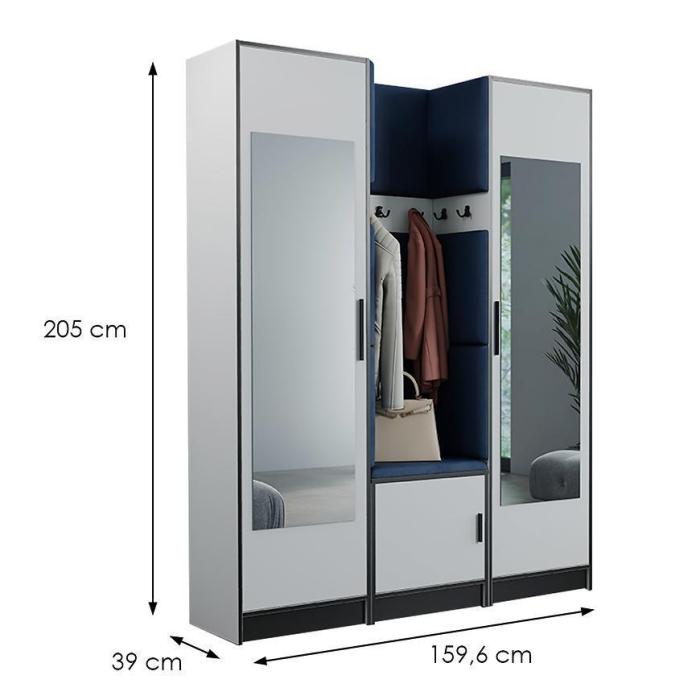 W skład zestawu wchodzi panel z wieszakami,szafką na dole i szafami. Dzięki, którym zyskamy łatwo dostępną przestrzeń do przechowywania rzeczy,ubrań i butów.