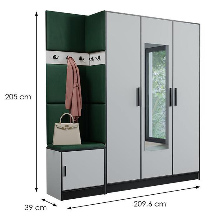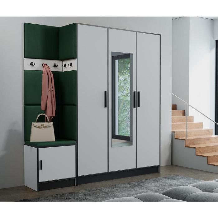 W skład zestawu wchodzi szafa oraz panel z wieszakami i szafką na dole. Dzięki, którym zyskamy łatwo dostępną przestrzeń do przechowywania rzeczy,ubrań i butów.