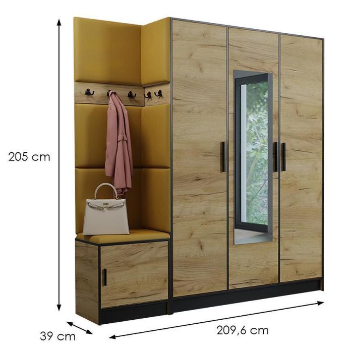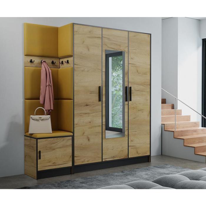 W skład zestawu wchodzi szafa oraz panel z wieszakami i szafką na dole. Dzięki, którym zyskamy łatwo dostępną przestrzeń do przechowywania rzeczy,ubrań i butów.