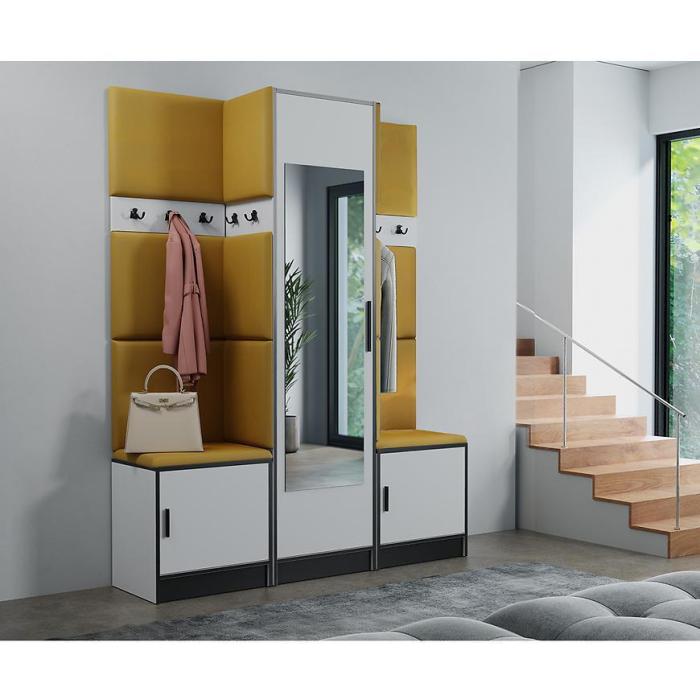 W skład zestawu wchodzą panele z wieszakami i szafką na dole i szafa. Dzięki, którym zyskamy łatwo dostępną przestrzeń do przechowywania rzeczy,ubrań i butów.