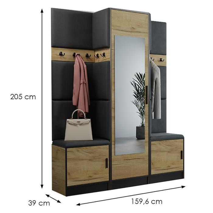W skład zestawu wchodzą panele z wieszakami i szafką na dole i szafa. Dzięki, którym zyskamy łatwo dostępną przestrzeń do przechowywania rzeczy,ubrań i butów.
