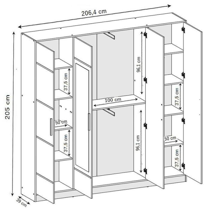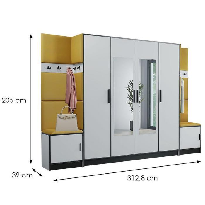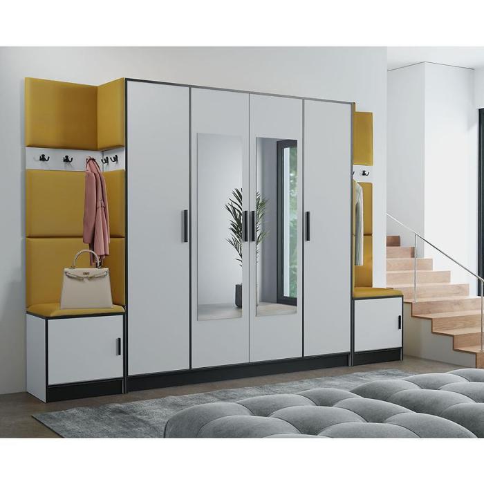 W skład zestawu wchodzą panele z wieszakami i szafką na dole i szafa. Dzięki, którym zyskamy łatwo dostępną przestrzeń do przechowywania rzeczy,ubrań i butów.