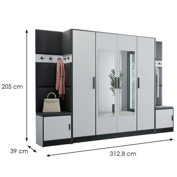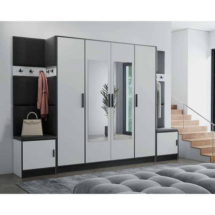 W skład zestawu wchodzą panele z wieszakami i szafką na dole i szafa. Dzięki, którym zyskamy łatwo dostępną przestrzeń do przechowywania rzeczy,ubrań i butów.