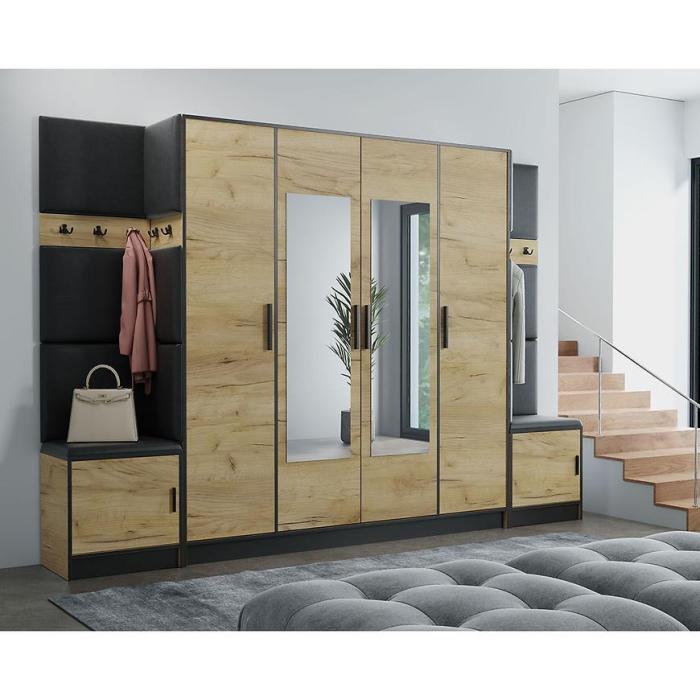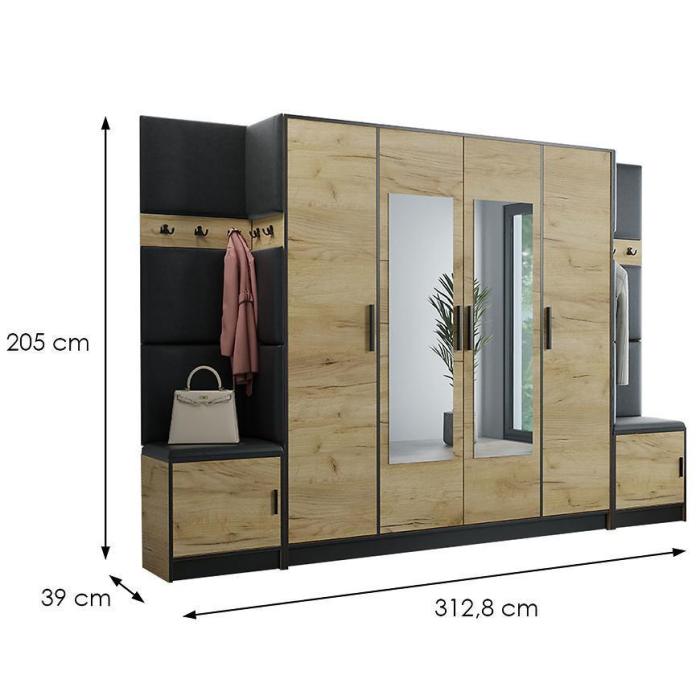 W skład zestawu wchodzą panele z wieszakami i szafką na dole i szafa. Dzięki, którym zyskamy łatwo dostępną przestrzeń do przechowywania rzeczy,ubrań i butów.