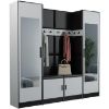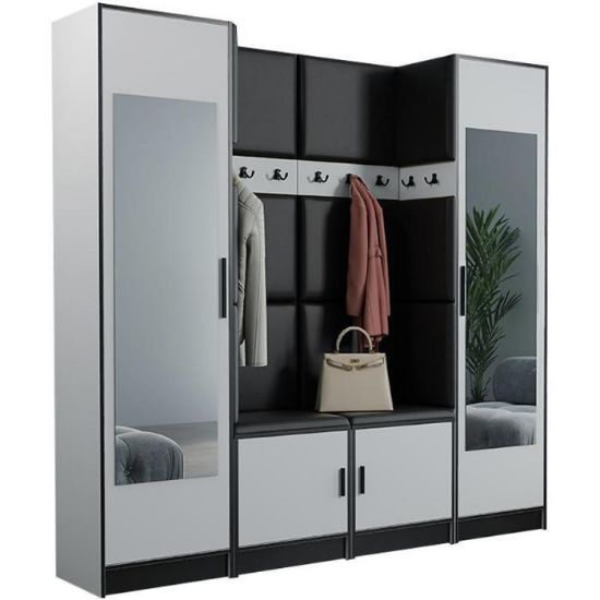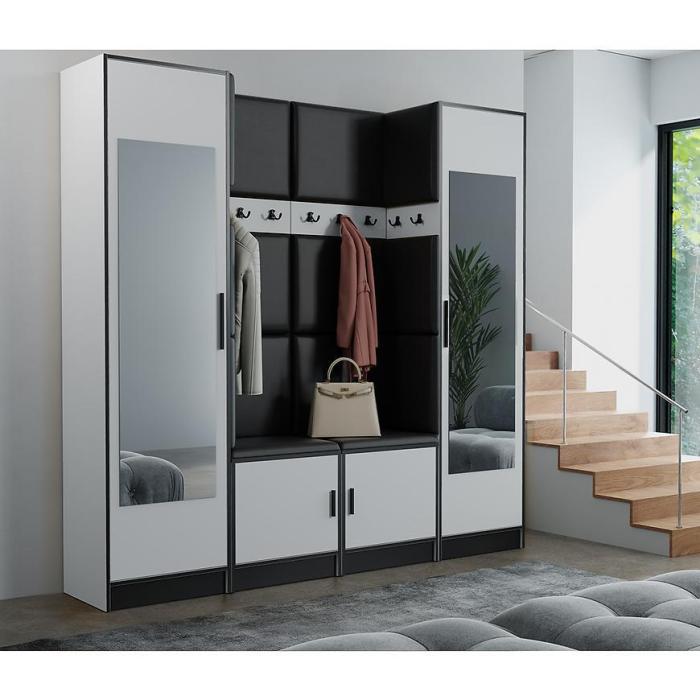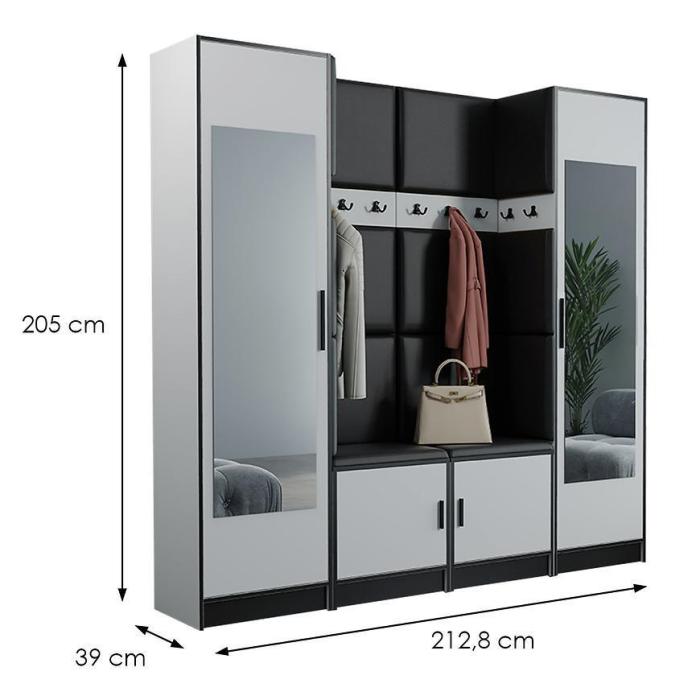 W skład zestawu wchodzą panele z wieszakami,szafkami na dole i szafami. Dzięki, którym zyskamy łatwo dostępną przestrzeń do przechowywania rzeczy,ubrań i butów.