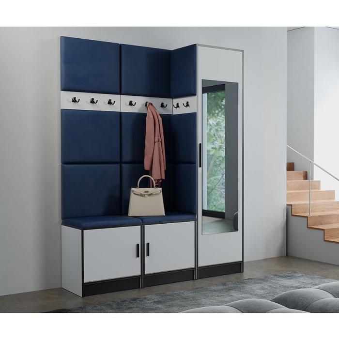 W skład zestawu wchodzą panele z wieszakami i szafką na dole i szafa. Dzięki, którym zyskamy łatwo dostępną przestrzeń do przechowywania rzeczy,ubrań i butów.