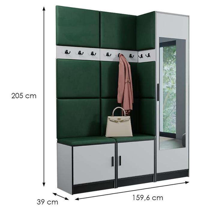 W skład zestawu wchodzą panele z wieszakami i szafką na dole i szafa. Dzięki, którym zyskamy łatwo dostępną przestrzeń do przechowywania rzeczy,ubrań i butów.