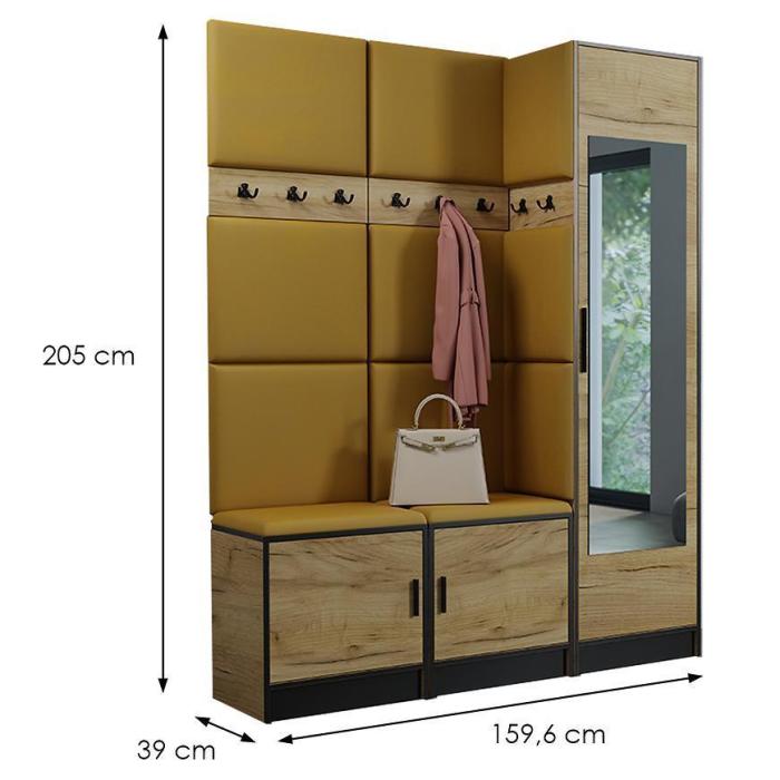 W skład zestawu wchodzą panele z wieszakami i szafką na dole i szafa. Dzięki, którym zyskamy łatwo dostępną przestrzeń do przechowywania rzeczy,ubrań i butów.