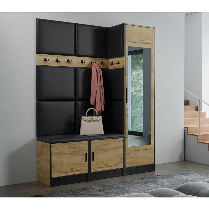W skład zestawu wchodzą panele z wieszakami i szafką na dole i szafa. Dzięki, którym zyskamy łatwo dostępną przestrzeń do przechowywania rzeczy,ubrań i butów.