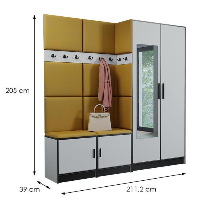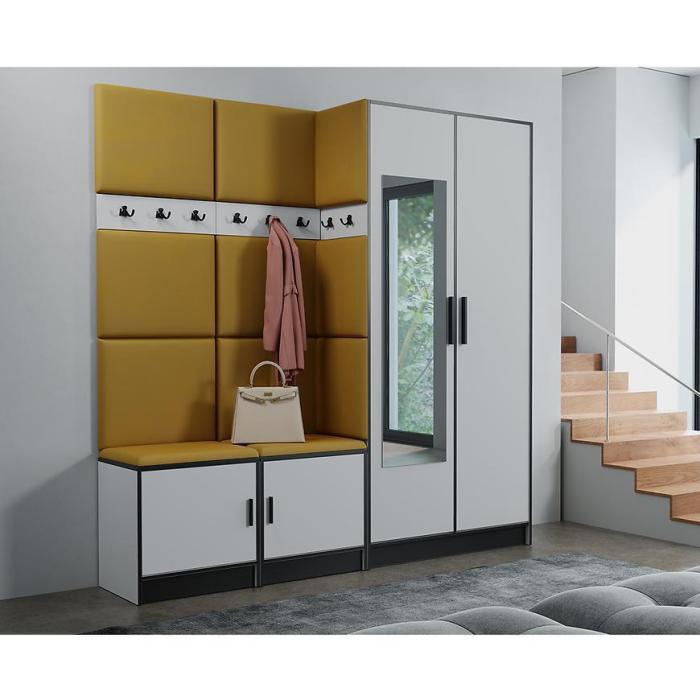 W skład zestawu wchodzą panele z wieszakami i szafką na dole i szafa. Dzięki, którym zyskamy łatwo dostępną przestrzeń do przechowywania rzeczy,ubrań i butów.