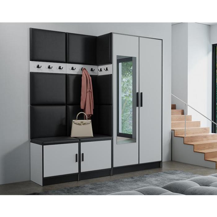 W skład zestawu wchodzą panele z wieszakami i szafką na dole i szafa. Dzięki, którym zyskamy łatwo dostępną przestrzeń do przechowywania rzeczy,ubrań i butów.