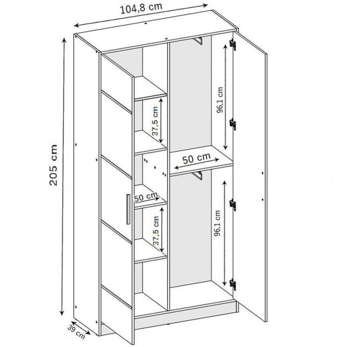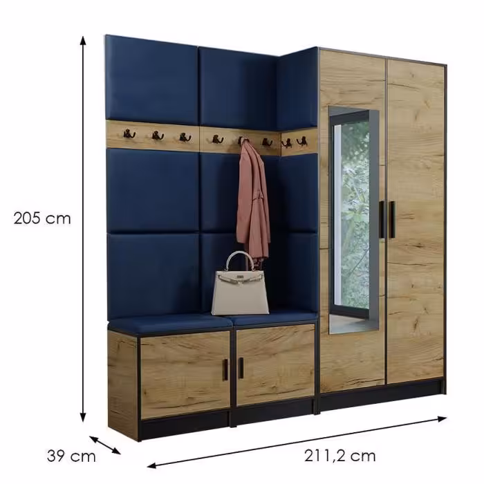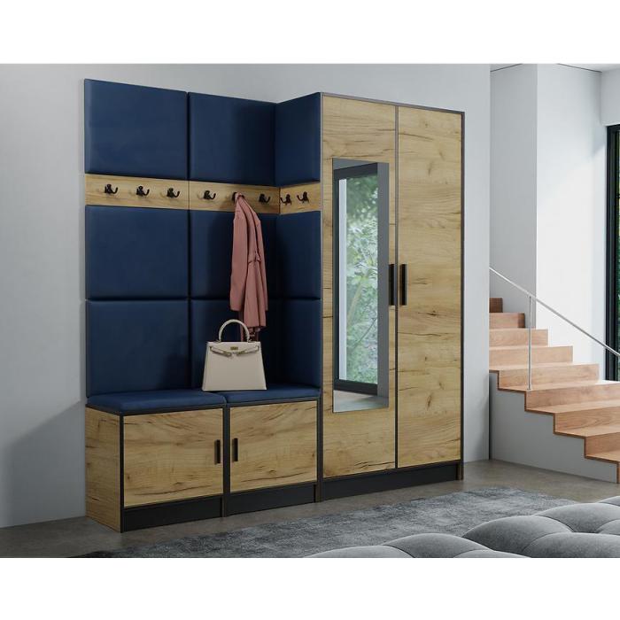 W skład zestawu wchodzą panele z wieszakami i szafką na dole i szafa. Dzięki, którym zyskamy łatwo dostępną przestrzeń do przechowywania rzeczy,ubrań i butów.