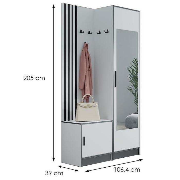 W skład zestawu wchodzi szafa oraz panel z wieszakami i szafką na dole. Dzięki, którym zyskamy łatwo dostępną przestrzeń do przechowywania rzeczy,ubrań i butów.