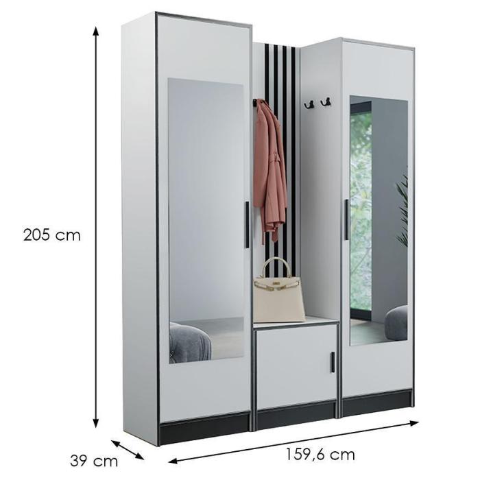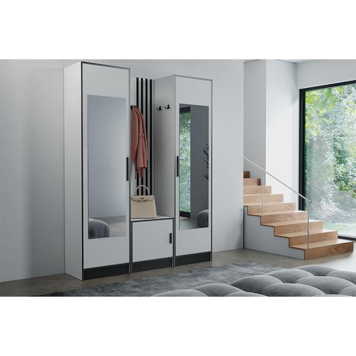 W skład zestawu wchodzi szafa oraz panel z wieszakami i szafką na dole. Dzięki, którym zyskamy łatwo dostępną przestrzeń do przechowywania rzeczy,ubrań i butów.