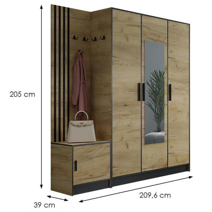 W skład zestawu wchodzi szafa oraz panel z wieszakami i szafką na dole. Dzięki, którym zyskamy łatwo dostępną przestrzeń do przechowywania rzeczy,ubrań i butów.