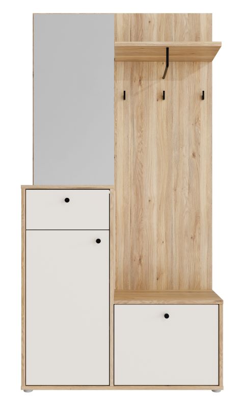 Meble do przedpokoju z kolekcji Tamworth to nowoczesny system utrzymany w delikatnej kolorystyce piaskowego beżu i dębu mauvella, która wprowadza do wnętrza ciepło i idealnie wpasuje się w jasne oraz ciemne aranżacje. Metalowe uchwyty w kolorze czarnym. Drzwi wyposażone w system cichego domyku. W szufladach zastosowano prowadnice z mechanizmem pełnego wysuwu. W skład kolekcji wchodzą nastepujące bryły: komoda 2D, komoda 3D1S, szafa na buty, przedpokój (zestaw komoda + lustro), garderoba.