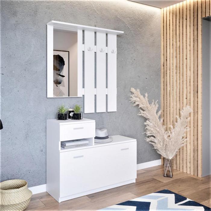 Kolekcja Vegas to nowoczesne i stylowe meble do przedpokoju wykonane z płyty wiórowej laminowanej. Konstrukcja składa sie z dwóch części szafki oraz wieszaka z lustrem i haczykami. Znajdzie się tu miejsce, aby schować buty , powiesić kurtkę czy położyć torebkę.