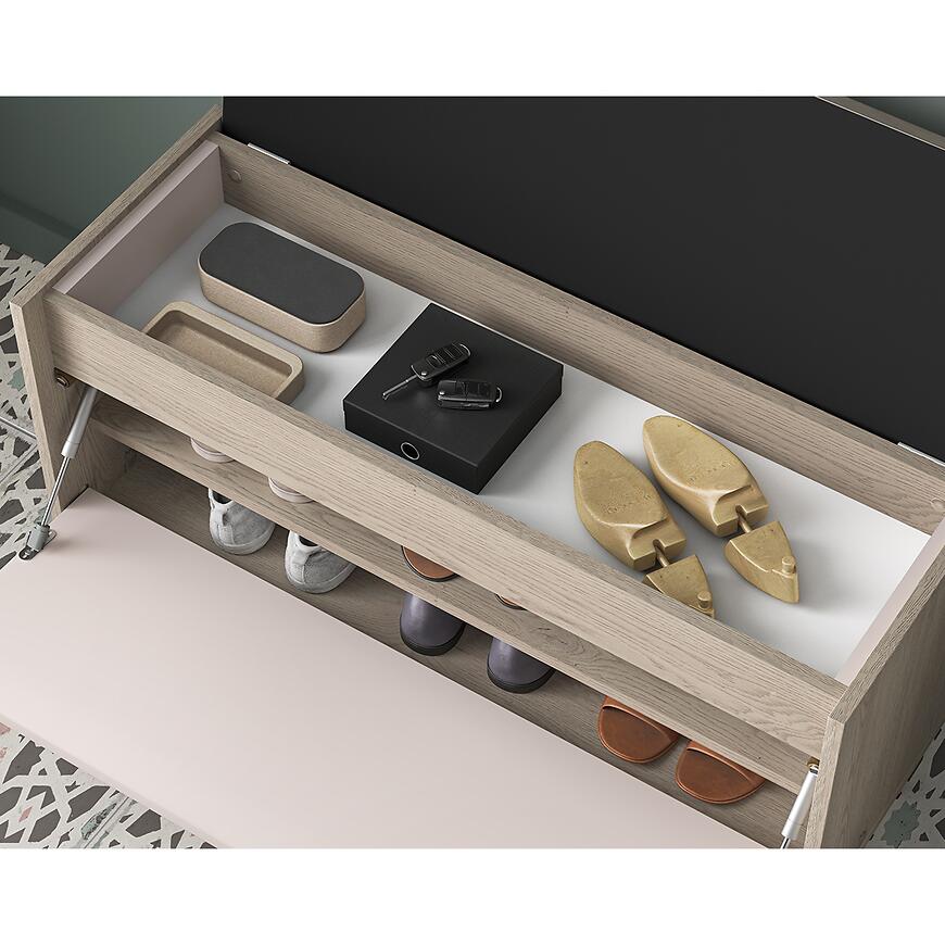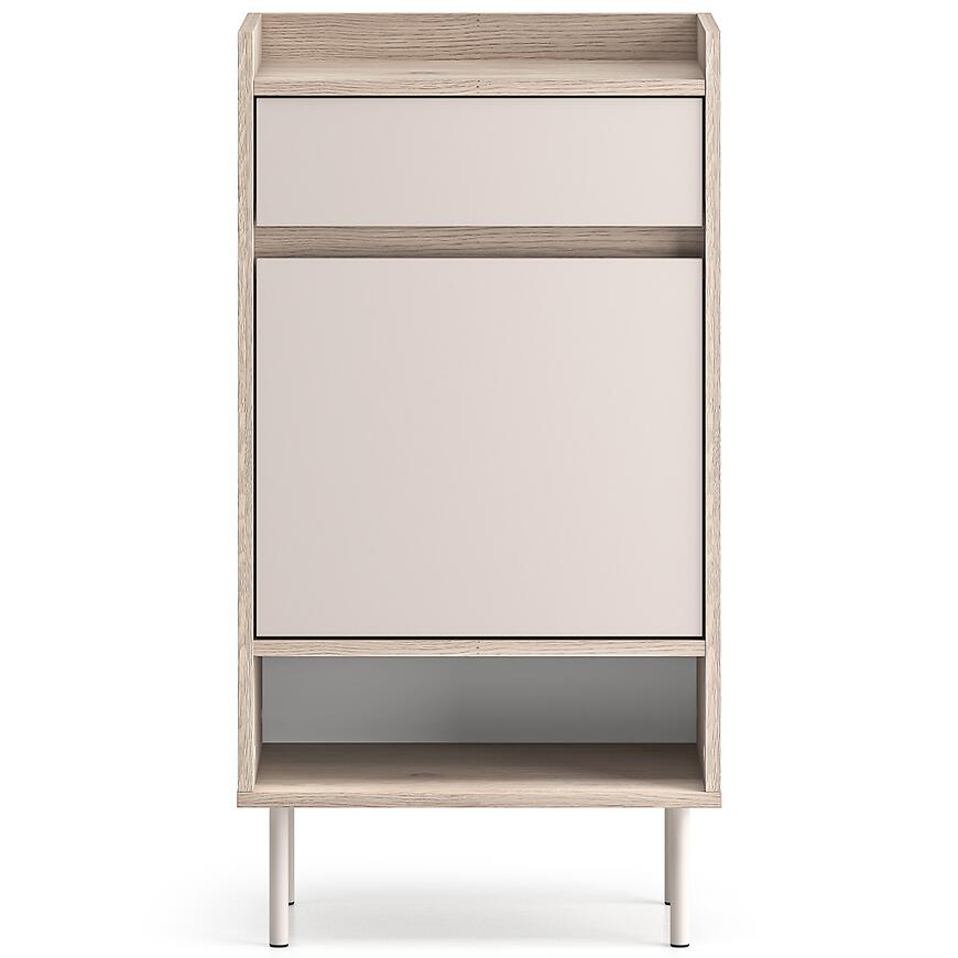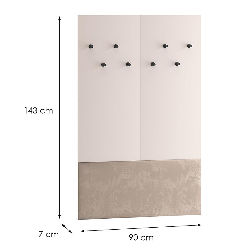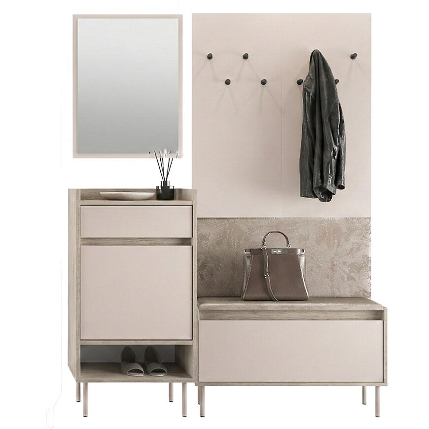 Dzięki klasycznemu designowi garderoba Voco V stanowi harmonijny element wyposażenia wnętrza, który łączy estetykę z wygodą użytkowania. Neutralny odcień kaszmir frontów sprawia, że mebel komponuje się z różnymi kolorami ścian i podłóg, a jasny dąb cremona optycznie rozjaśnia przestrzeń. Brak oświetlenia nie ogranicza praktyczności, a minimalistyczny, elegancki wygląd pozwala na dopasowanie garderoby do innych elementów meblowych z kolekcji VOCO.