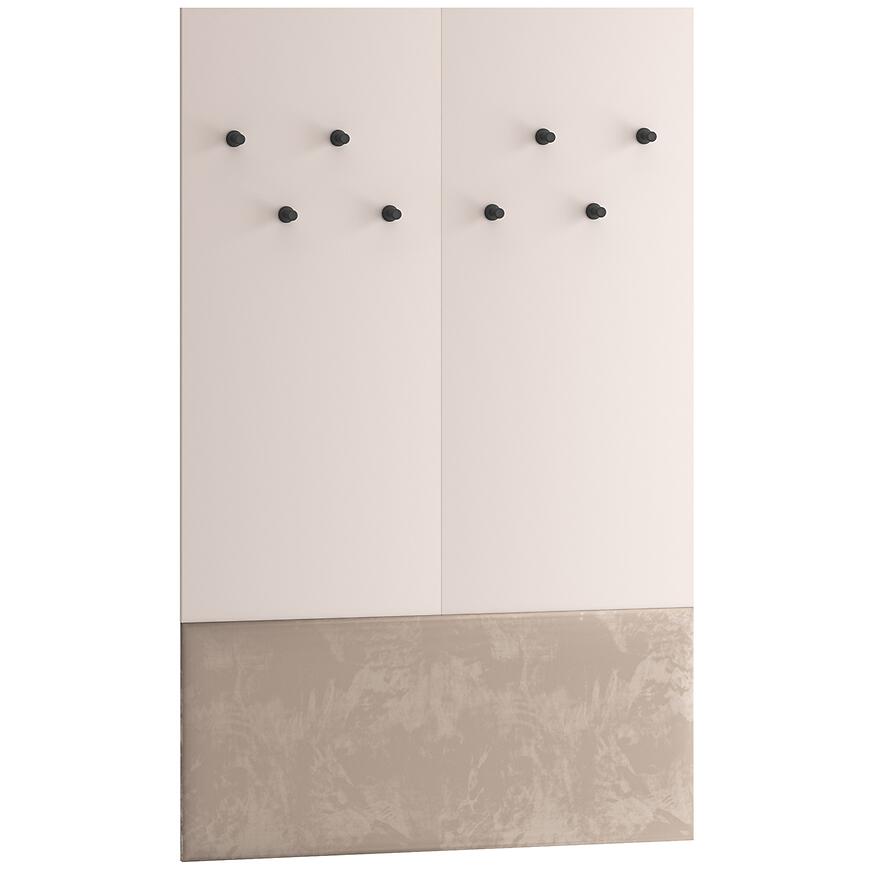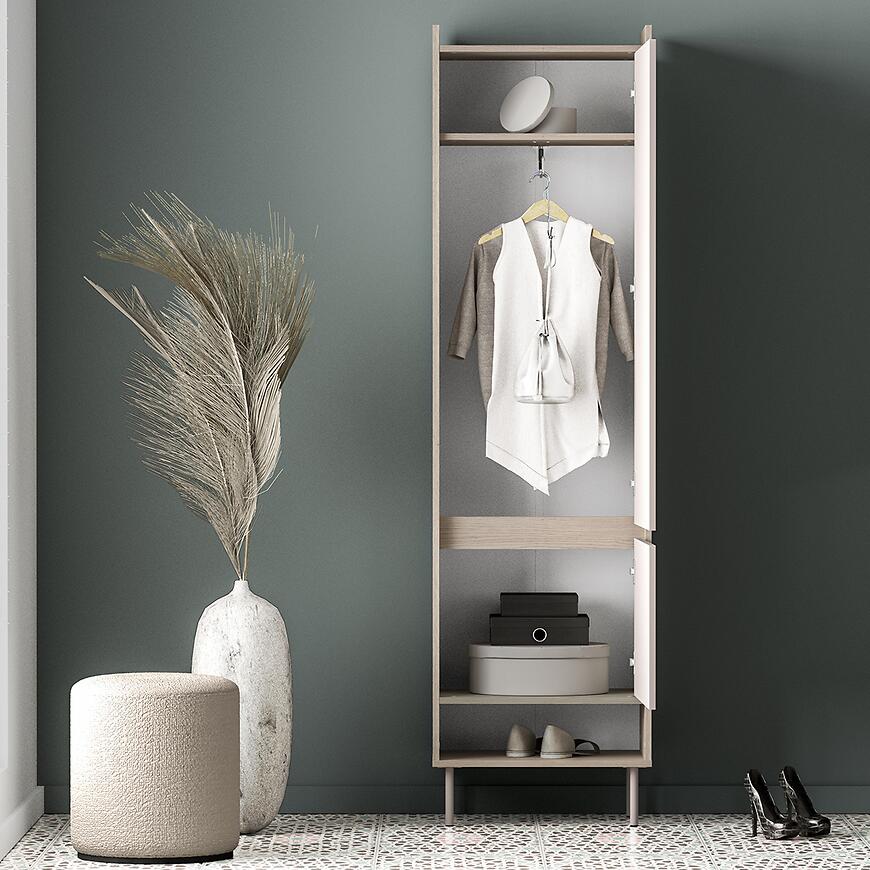 Dzięki klasycznemu designowi garderoba Voco VI stanowi harmonijny element wyposażenia wnętrza, który łączy estetykę z wygodą użytkowania. Neutralny odcień kaszmir frontów sprawia, że mebel komponuje się z różnymi kolorami ścian i podłóg, a jasny dąb cremona optycznie rozjaśnia przestrzeń. Brak oświetlenia nie ogranicza praktyczności, a minimalistyczny, elegancki wygląd pozwala na dopasowanie garderoby do innych elementów meblowych z kolekcji VOCO.