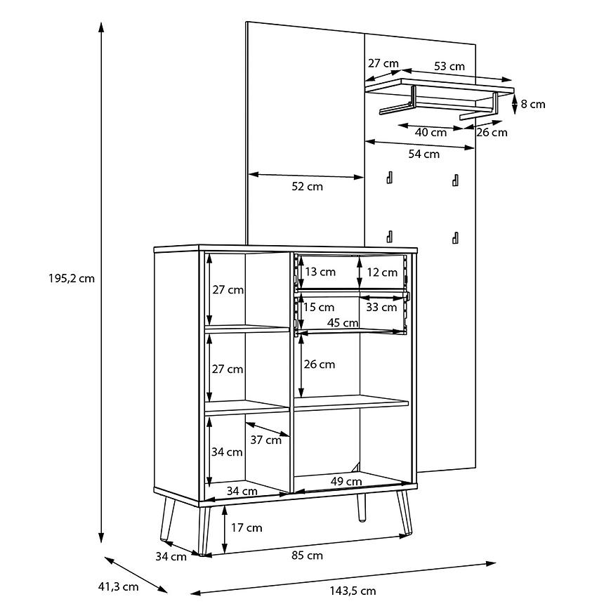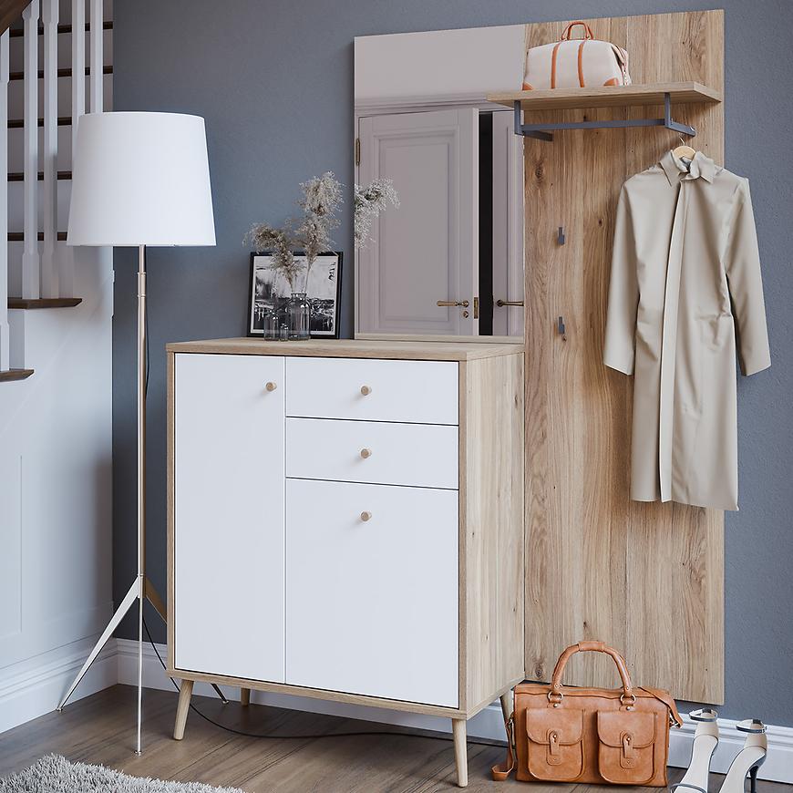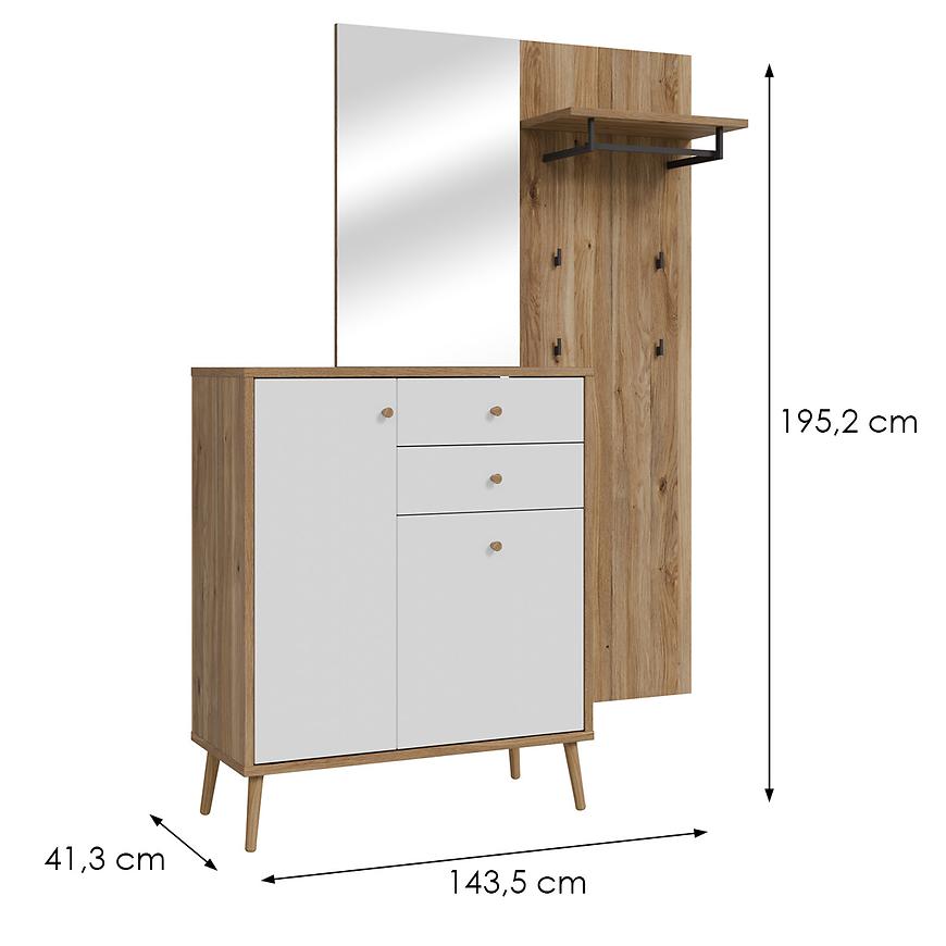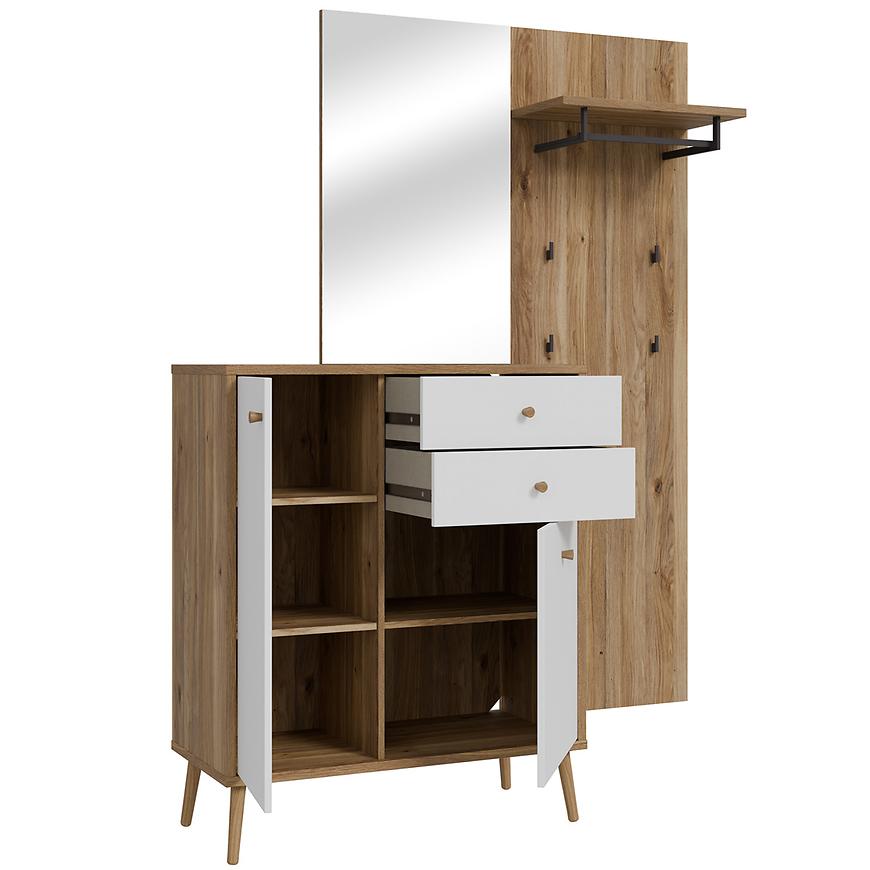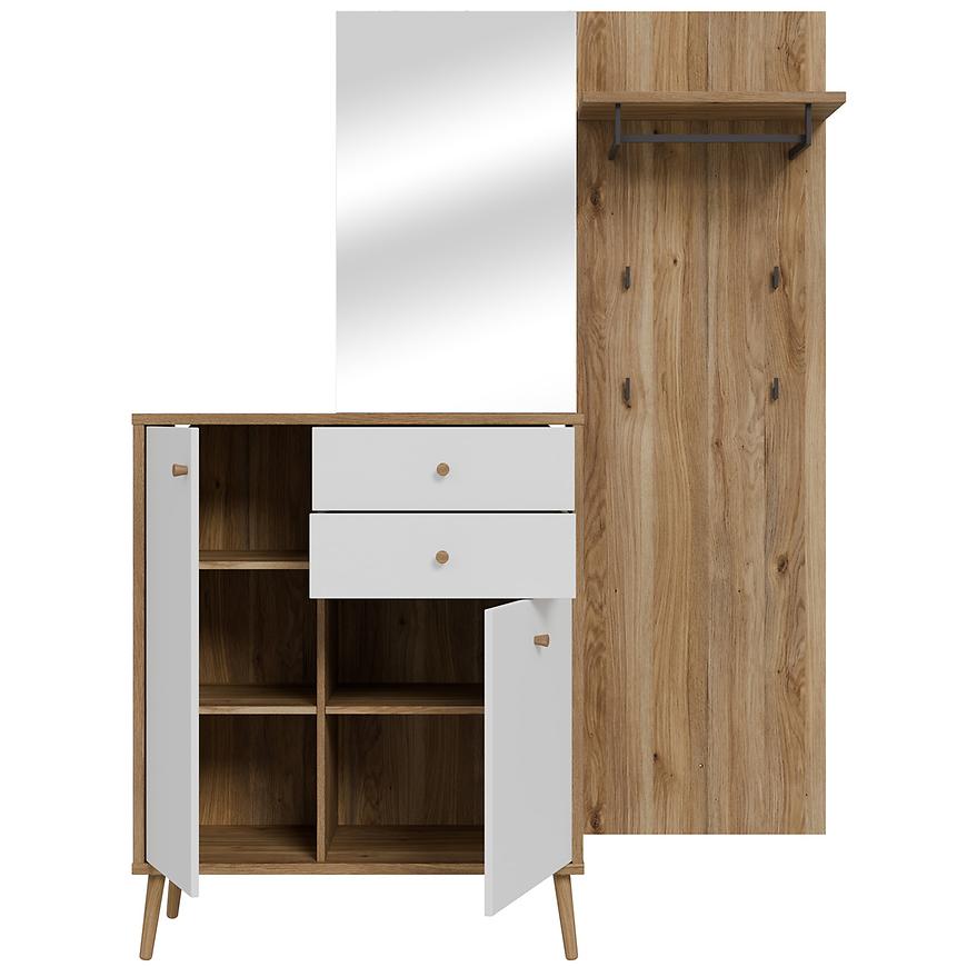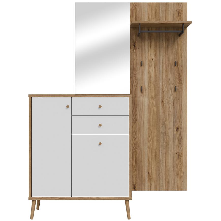 Garderoba Whenua dostępna w dekorze dąb Mauvella, fronty w kolorze białym matowym. Garderoba składa się z komody dwudrzwiowej w dwoma szufladami, panelu z wieszakami i lustrem. Komoda osadzona na wysokich nóżkach.