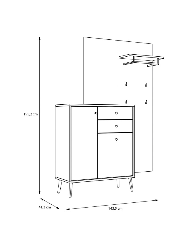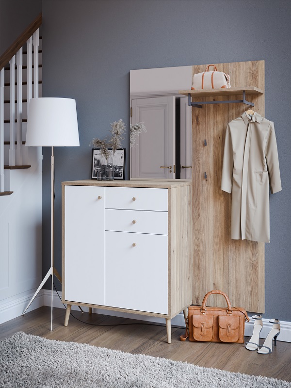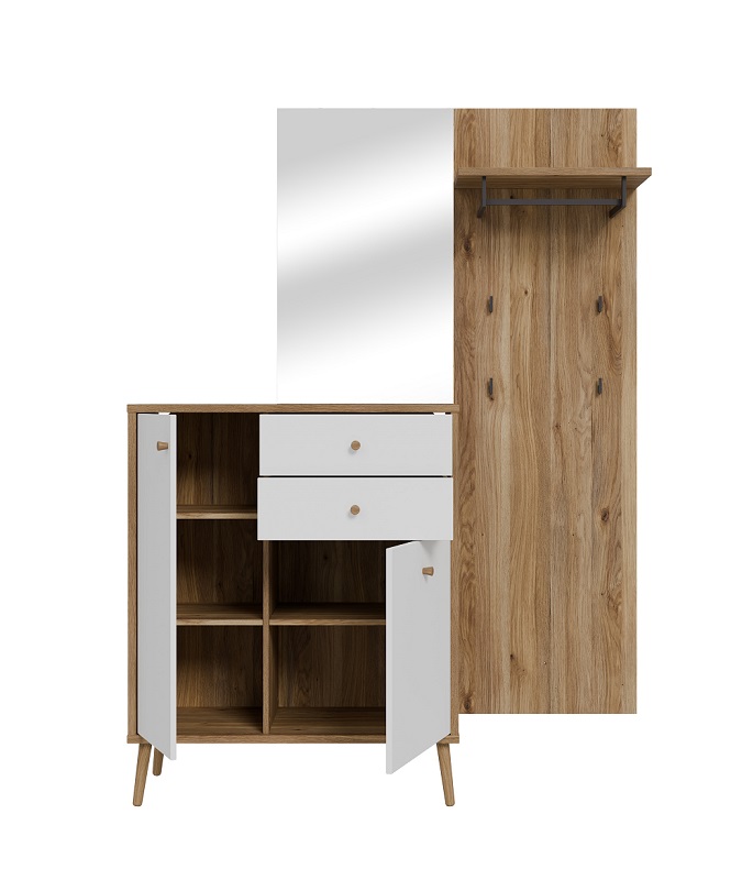 Garderoba Wenn w stylu nowoczesnym sprawdzi się jako godna wizytówka Twojego przedpokoju. Mebel tworzą: panel z półką, drążkiem na wieszaki i haczykami, lustro oraz szafka z wydzielonymi dwoma szafkami oraz dwoma szufladami. Taki podział wnętrza zapewnia miejsce zarówno do przechowywania kurtek, płaszczy, czapek, rękawiczek i 7 par butów, jak i ekspozycji kapeluszy lub wazonów. Wysokie, umieszczone pod skosem nóżki zapewniają solidne podparcie. Garderoba posiada wysokie nóżki z kolorze naturalnego dębu, korpus dostępny w dekorze dąb mauvella frontu w matowej bieli, delikatne uchwyty w kolorze naturalnego dębu.