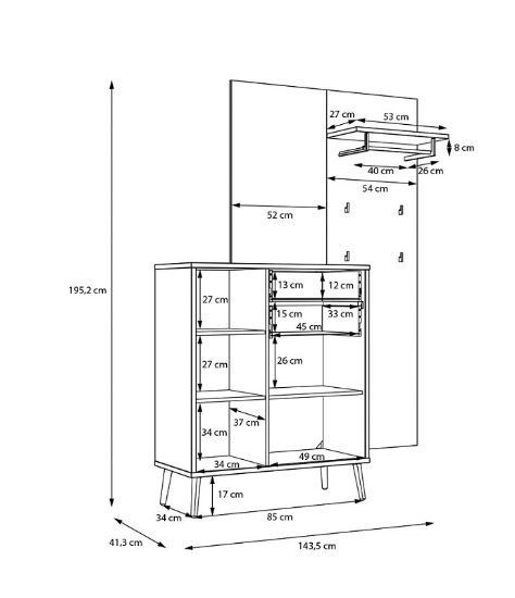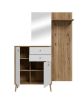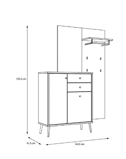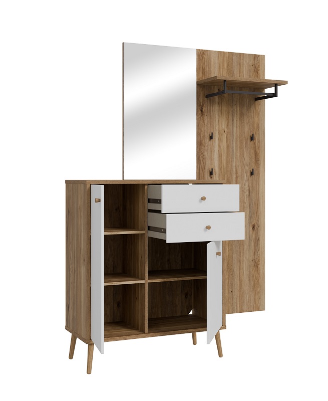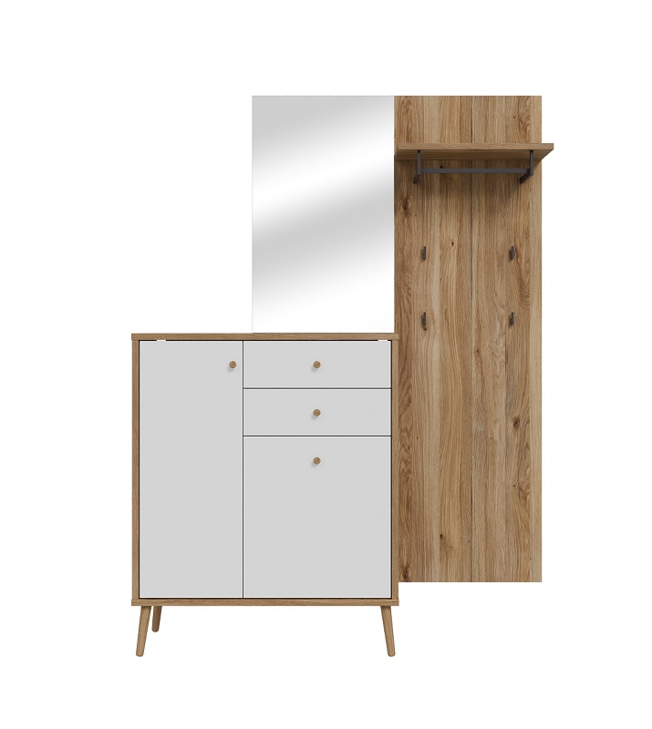 Garderoba Wenn w stylu nowoczesnym sprawdzi się jako godna wizytówka Twojego przedpokoju. Mebel tworzą: panel z półką, drążkiem na wieszaki i haczykami, lustro oraz szafka z wydzielonymi dwoma szafkami oraz dwoma szufladami. Taki podział wnętrza zapewnia miejsce zarówno do przechowywania kurtek, płaszczy, czapek, rękawiczek i 7 par butów, jak i ekspozycji kapeluszy lub wazonów. Wysokie, umieszczone pod skosem nóżki zapewniają solidne podparcie. Garderoba posiada wysokie nóżki z kolorze naturalnego dębu, korpus dostępny w dekorze dąb mauvella frontu w matowej bieli, delikatne uchwyty w kolorze naturalnego dębu.