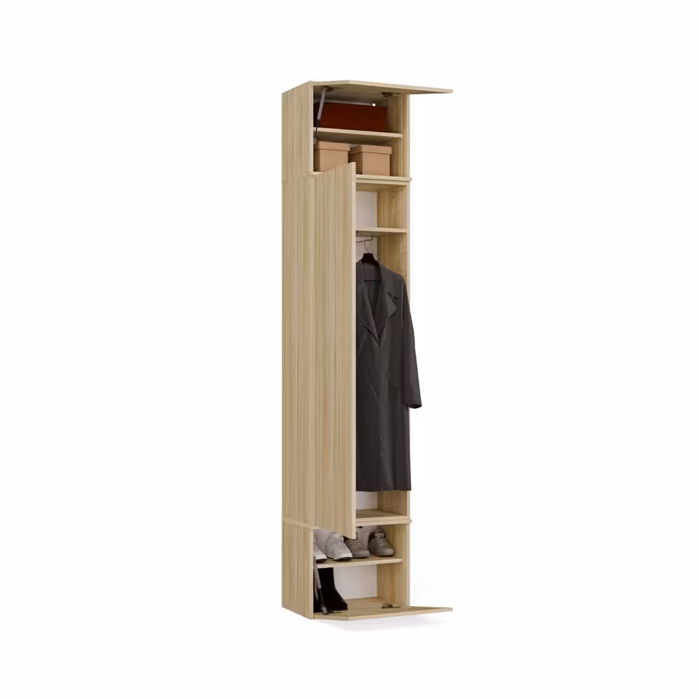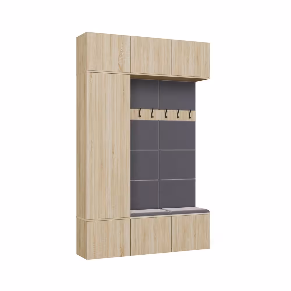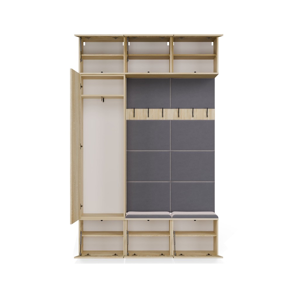 Garderoba z podwójnym wieszakiem Hamar III to nowoczesne i praktyczne rozwiązanie do przedpokoju, które łączy kompaktowy rozmiar z maksymalną użytecznością. Została zaprojektowana z myślą o użytkownikach ceniących porządek, wygodę oraz minimalistyczny styl. W skład zestawu wchodzi pojemny moduł szafy z drążkiem i półkami oraz 2 moduły z wieszakiem, tapicerowanym siedziskiem i szafkami.