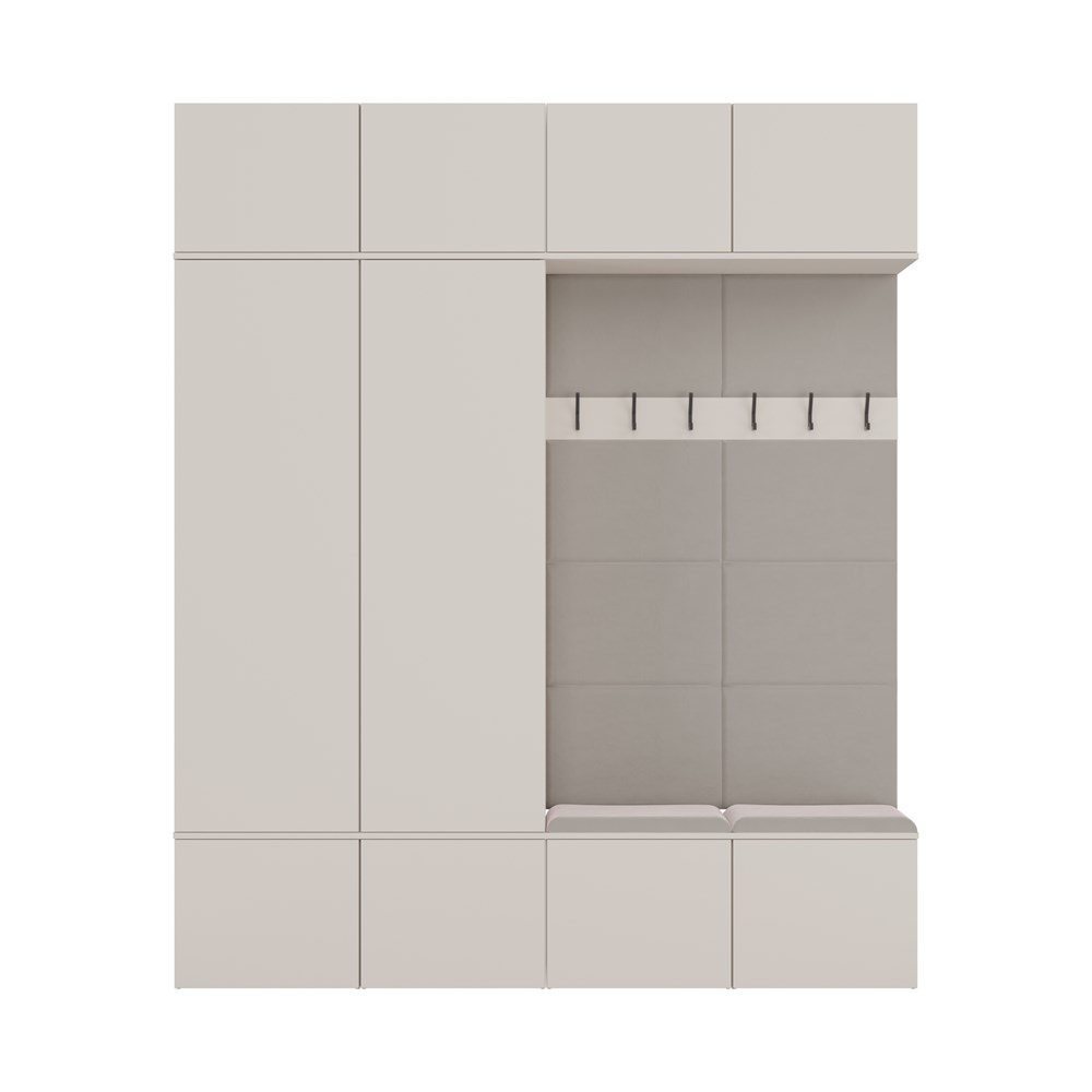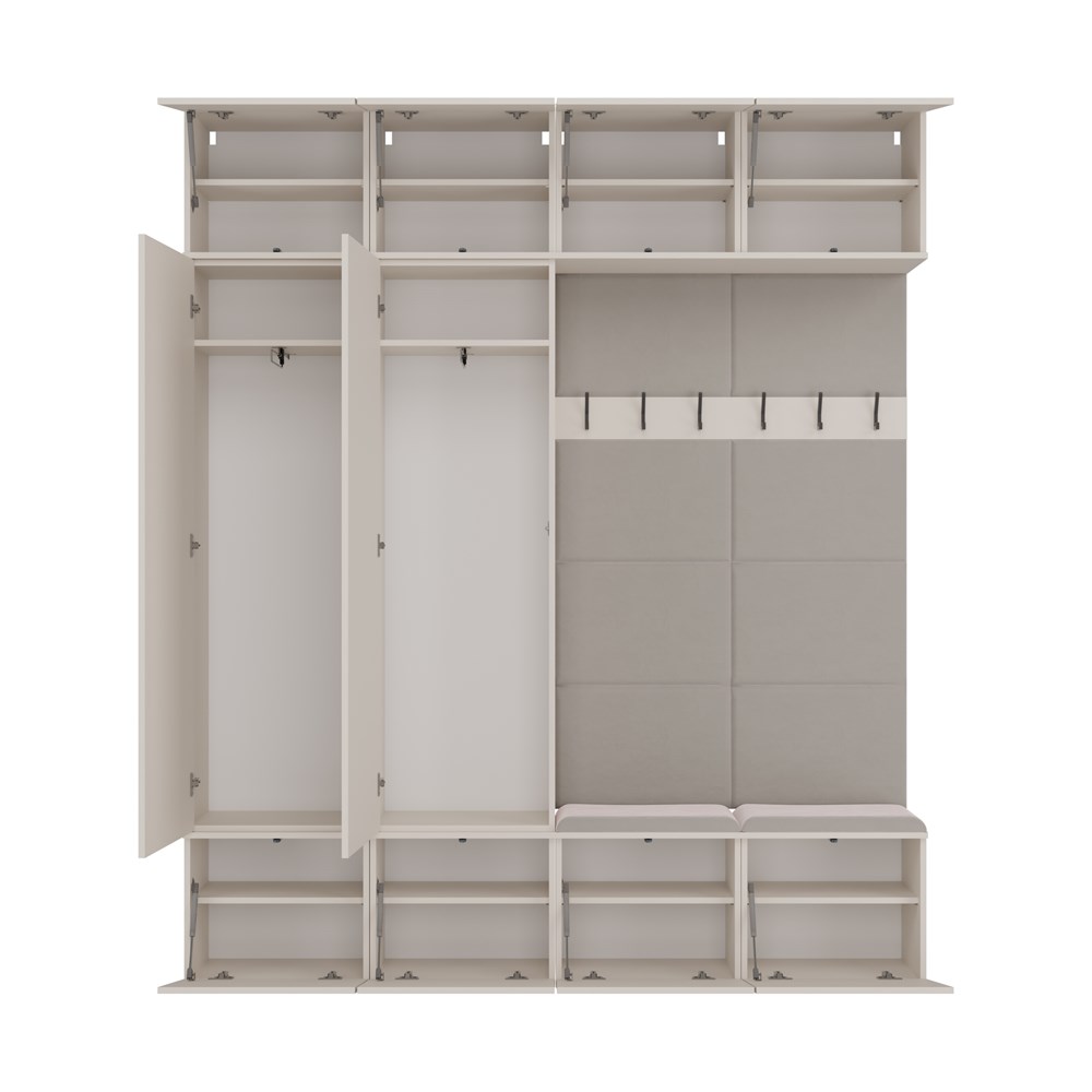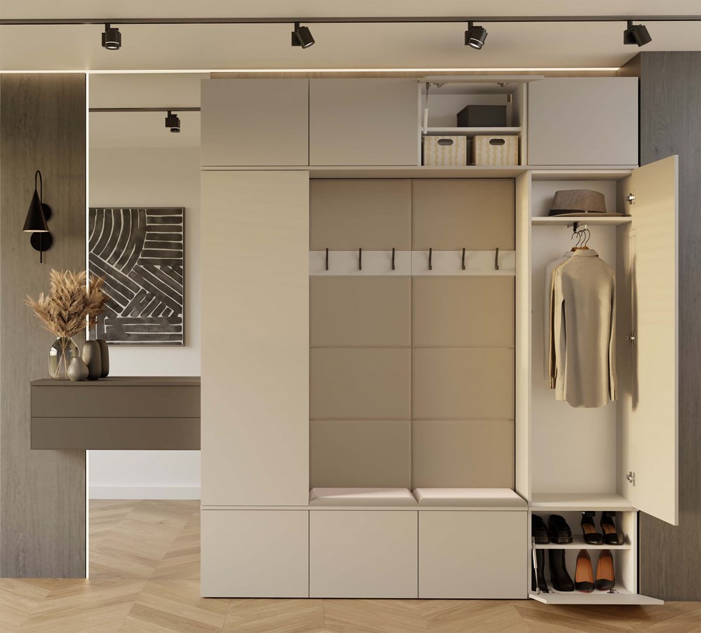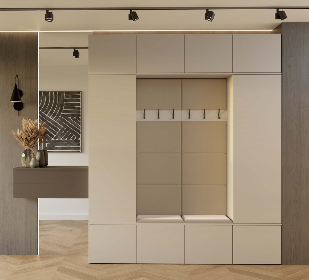 - Tapicerowane siedzisko z zamykaną dolną szafką na buty w kolorze beżowym