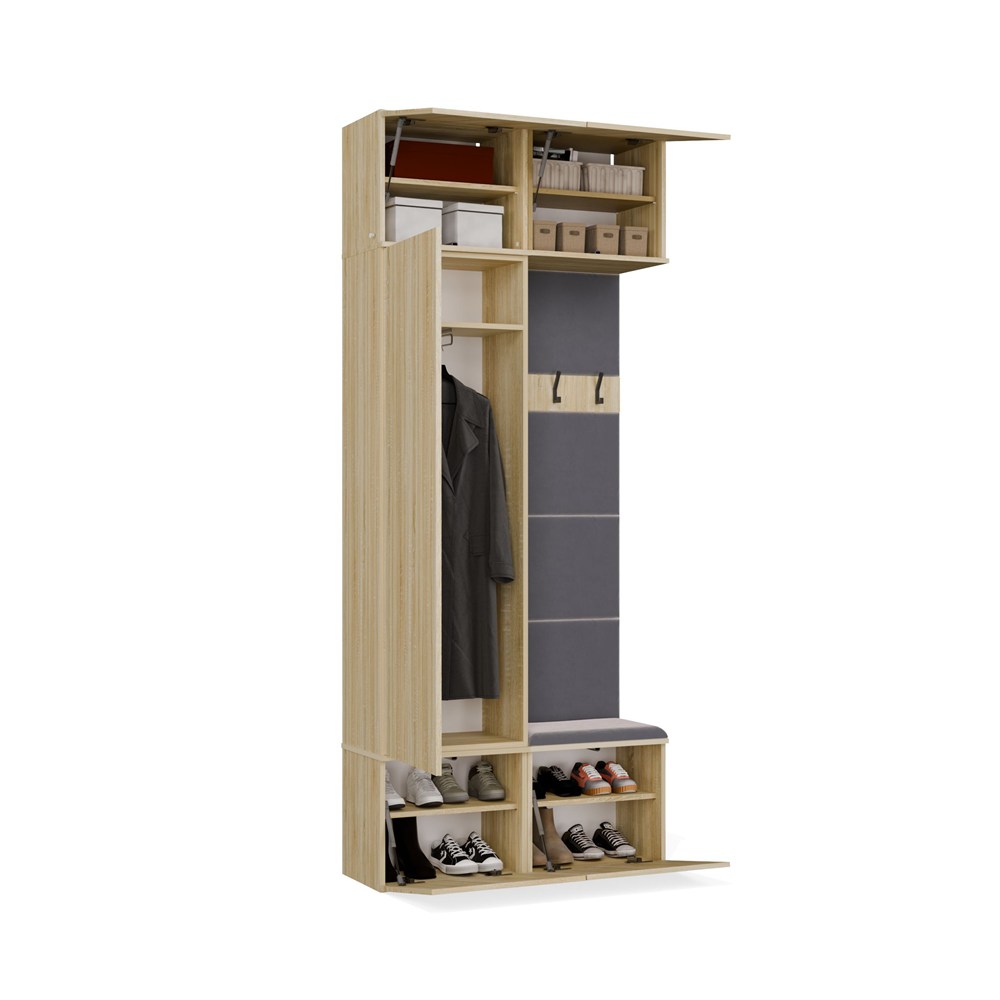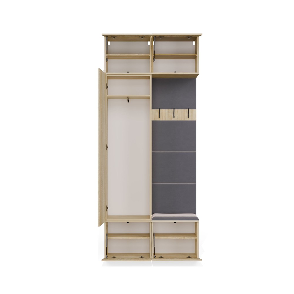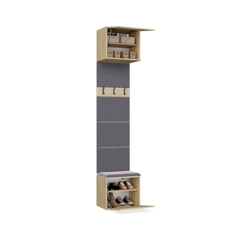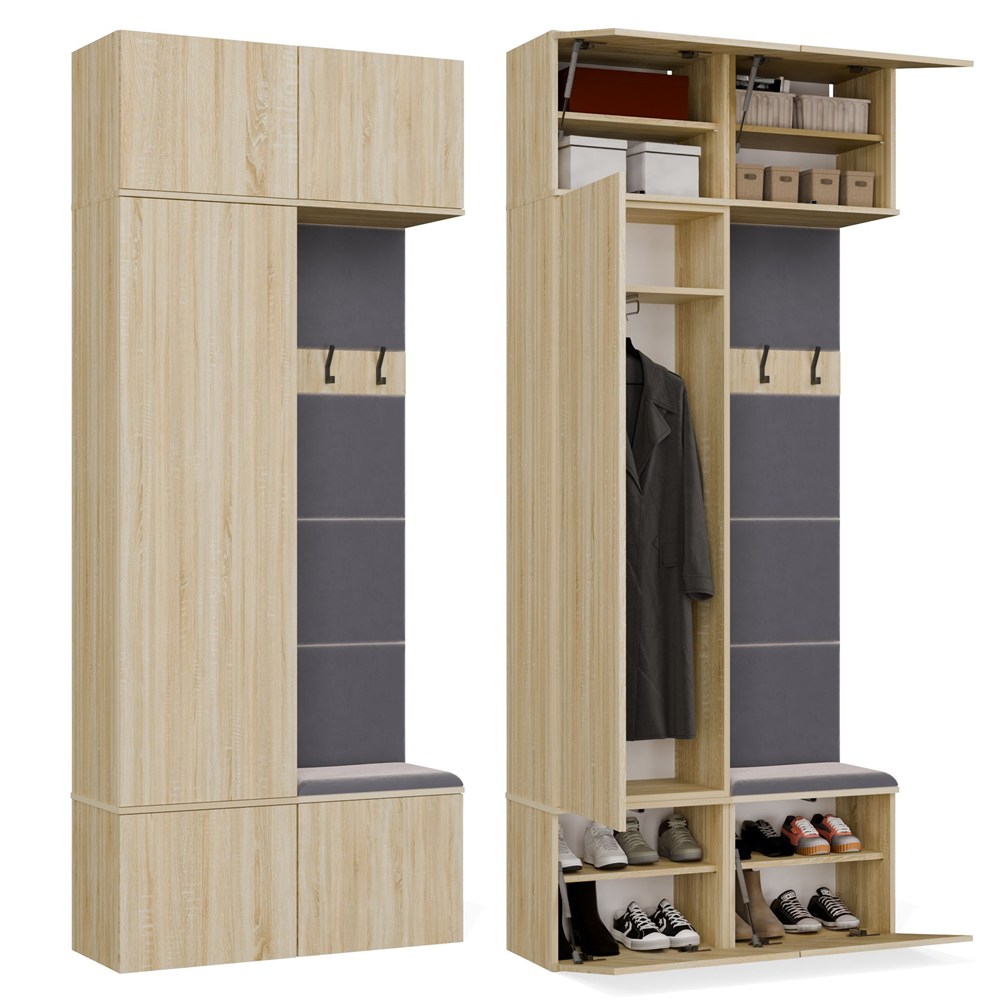W zamykanej szafie znajduje się drążek na odzież wierzchnią, dzięki czemu kurtki i płaszcze można wygodnie zawiesić i chronić przed zagnieceniem. Obok niej znajduje się tapicerowane siedzisko, które nie tylko podnosi komfort ubierania się, ale skrywa także praktyczną szafkę na buty.