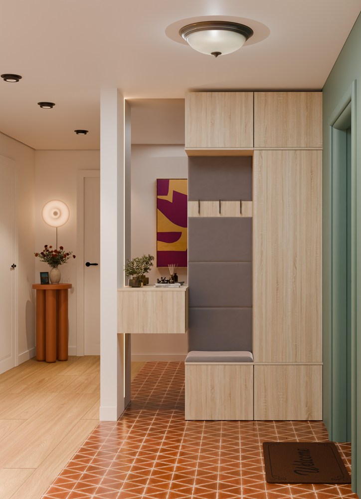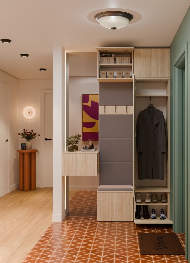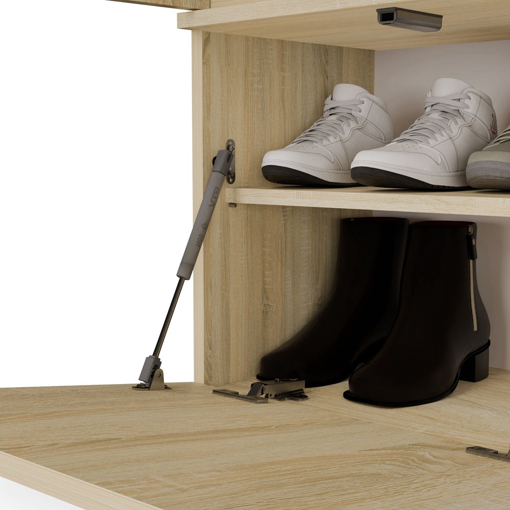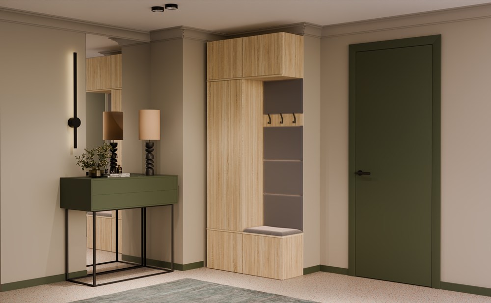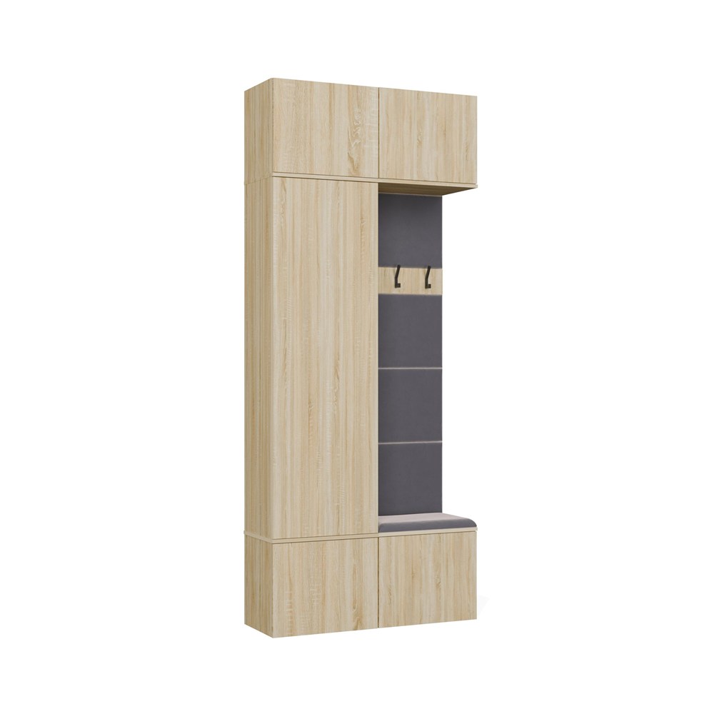 W zamykanej szafie znajduje się drążek na odzież wierzchnią, dzięki czemu kurtki i płaszcze można wygodnie zawiesić i chronić przed zagnieceniem. Obok niej znajduje się tapicerowane siedzisko, które nie tylko podnosi komfort ubierania się, ale skrywa także praktyczną szafkę na buty.